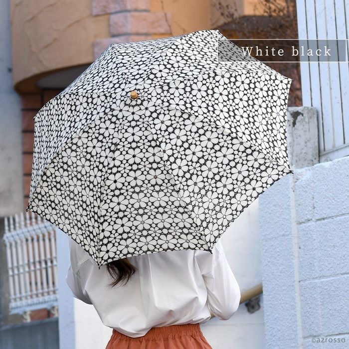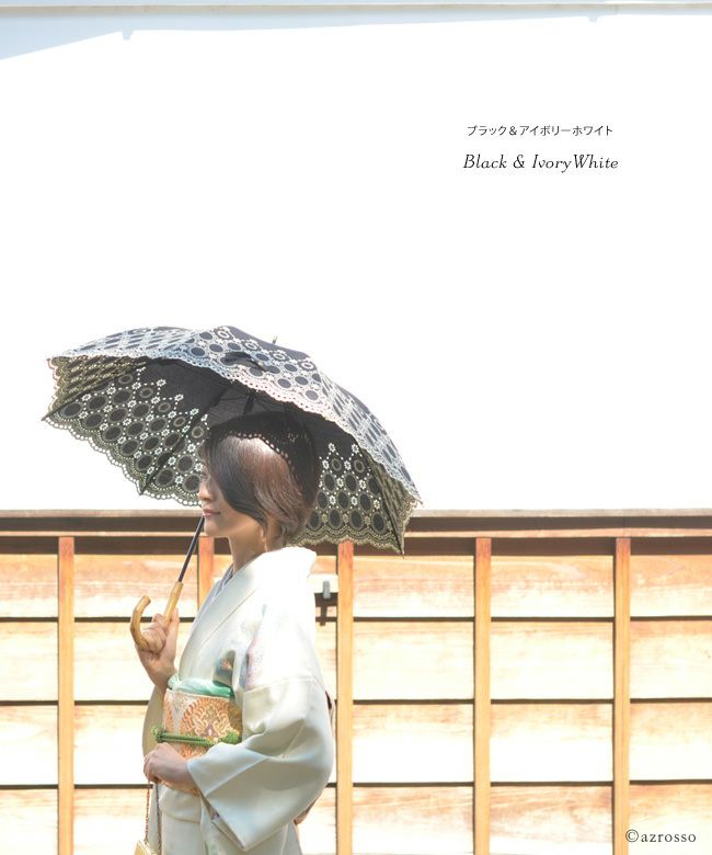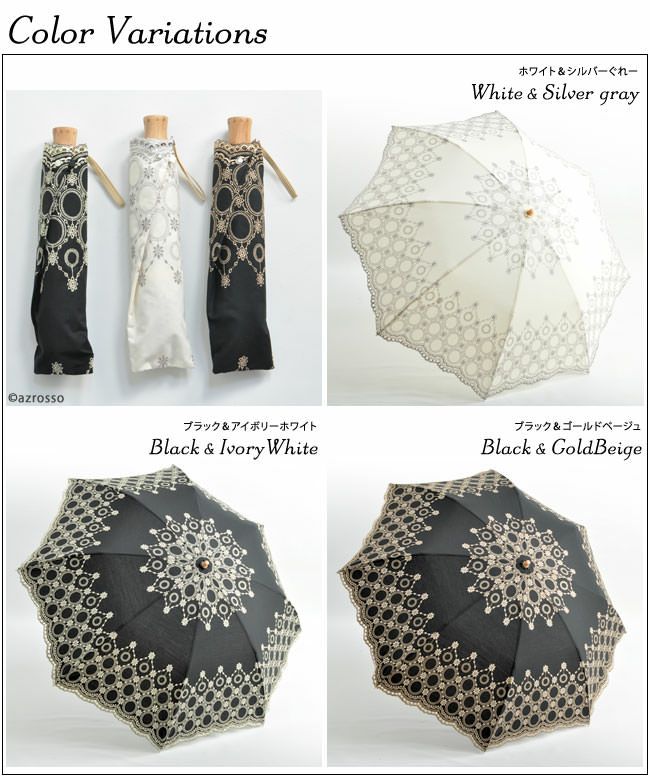 遮光性の高い 黒 ブラック おしゃれな 白 ホワイト 華やかなゴールドの刺繍の日傘 UVカット