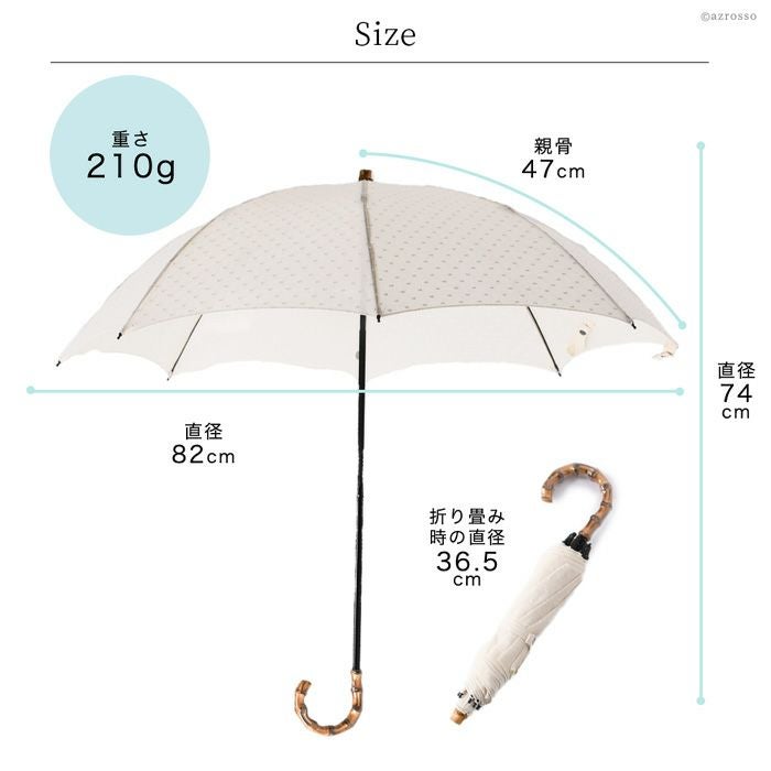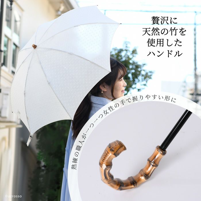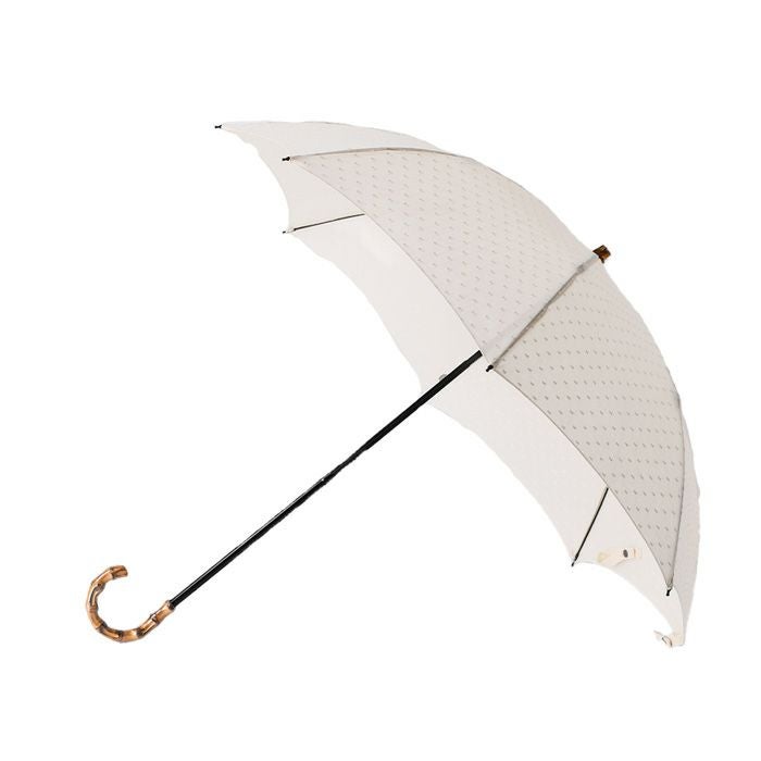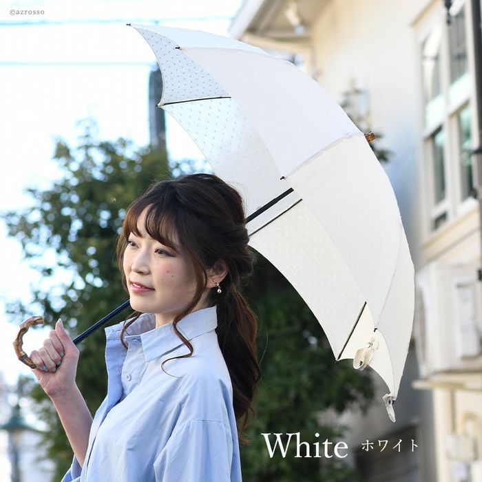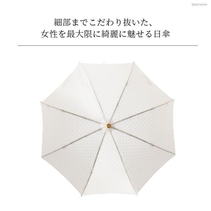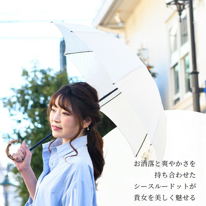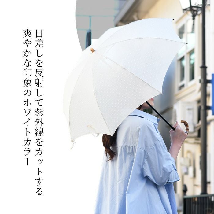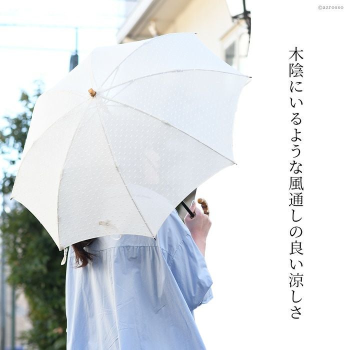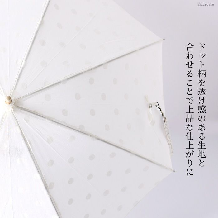 織模様の水玉とシースルーがアクセント。東京老舗の傘工房ワカオの布製日傘。和装にも似合う ワカオ コットン日傘 ドット 日本製 長傘 綿100 WAKAO バンブー タッセル 水玉 ホワイト 白 上品な日本ブランドの日傘