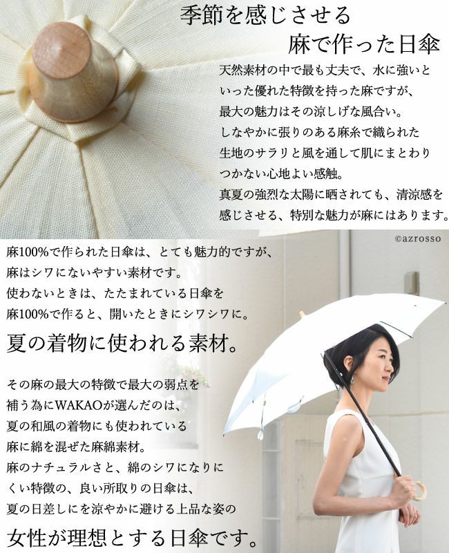 コットンリネンの日傘を国産ブランドワカオからお届け。大人気のロングセラー。持ち手は葡萄(ぶどう)中棒は樫(かし)の木の天然素材 ワカオ 日傘 コットンリネン 長傘 日本製 WAKAO 綿麻 天然木 持ち手 無地 撥水加工 おしゃれ 人気