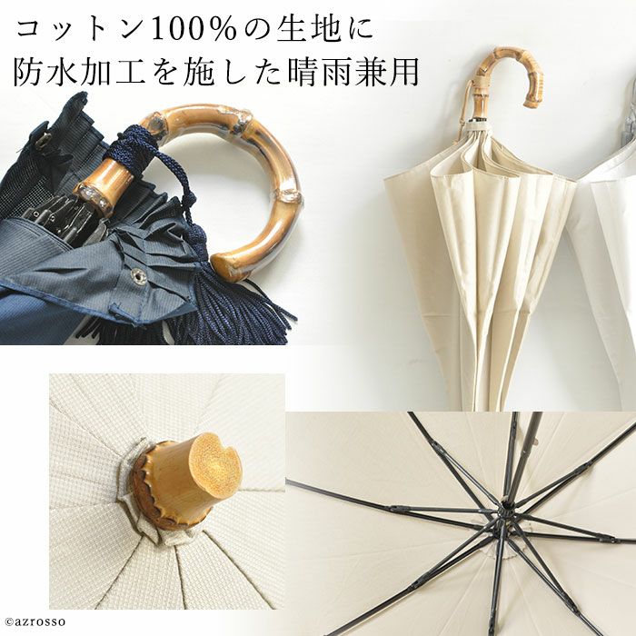 高級感ある天然寒竹の手元。撥水加工で突然雨も安心。着物 和装 浴衣にも似合う美しい日傘ワカオ 【在庫限り】ワカオ 日傘 長傘 生地 日本製 WAKAO コットン 綿100 バンブーハンドル タッセル 無地 撥水加工