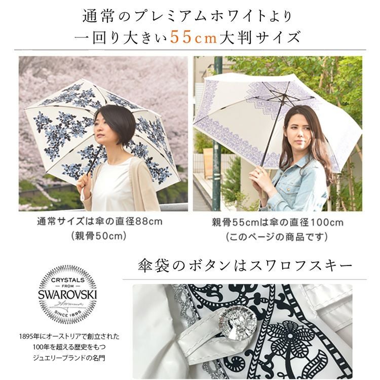 プレミアムホワイトは、ホワイトカラーであるにもかかわらず、紫外線は99%以上、赤外線も98.5%以上カット、傘の内部温度を約10℃も下げてくれる画期的な日傘です。