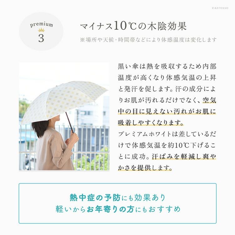プレミアムホワイトは、ホワイトカラーであるにもかかわらず、紫外線は99%以上、赤外線も98.5%以上カット、傘の内部温度を約10℃も下げてくれる画期的な日傘です。