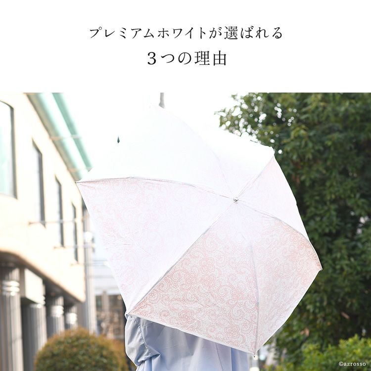 プレミアムホワイトは、ホワイトカラーであるにもかかわらず、紫外線は99%以上、赤外線も98.5%以上カット、傘の内部温度を約10℃も下げてくれる画期的な日傘です。