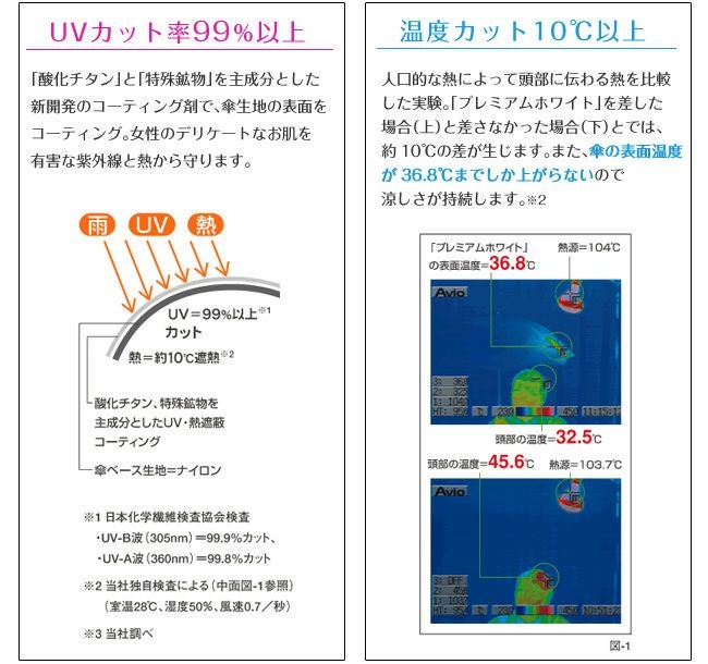 UVカット率99%以上の白い日傘。温度カット10℃以上のひんやりクールダウン効果のあるUVION Premium white(ユビオン プレミアムホワイト)。上品なレース柄折り畳み傘は旅行やスポーツ観戦のお供にもおすすめ レース柄 日傘 折りたたみ 晴雨兼用 UVION ユビオン プレミアムホワイト 日本製 超軽量 日本製 驚きの殺菌力と抗菌力をもつ日傘