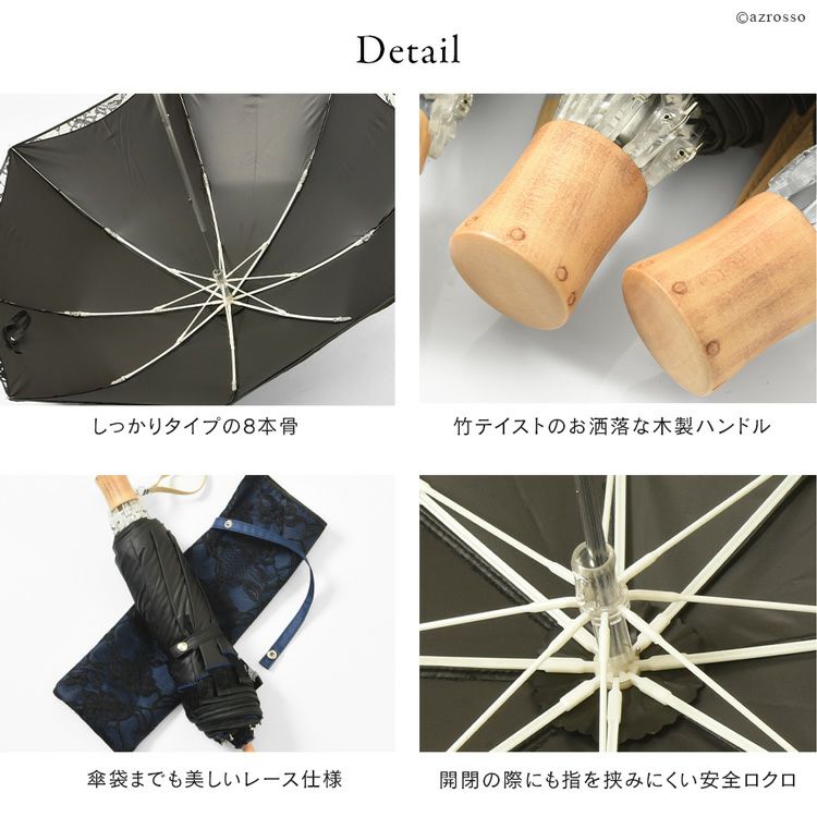 二重張りのラッセルレースに美しく透ける薔薇とドット、竹テイストのおしゃれなハンドル、開いた時の形がきれいな2段8本骨。