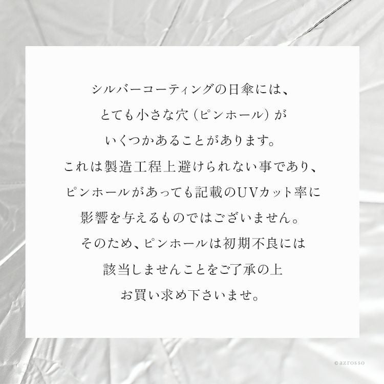 シルバーコーティングの日傘には、とても小さな穴(ピンホール)がいくつかあることがあります。これは製造工程上避けられない事であり、ピンホールがあっても記載のUVカット率に影響を与える者ではございません。そのため、ピンホールは初期不良には該当しませんことをご了承の上お買い求め下さいませ。