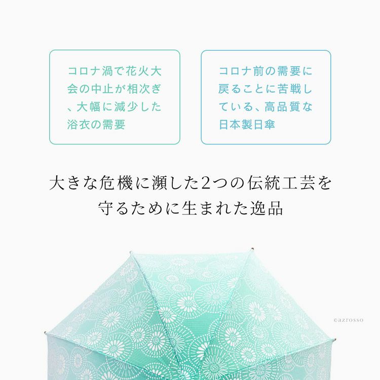 国産傘ワカオ(WAKAO)×日本橋の反物メーカーがコラボ。すべてが1点もののおしゃれな浴衣日傘。着物や和装に似合う大人の夏の日傘 ワカオ 日傘 長傘 日本製 浴衣生地の日傘 WAKAO 三勝染め バンブーハンドル 寒竹 WAKAO