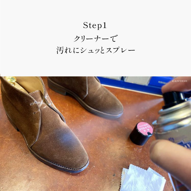 スエード・ヌバックなどの起毛皮革靴の汚れ落しスプレーです。靴の表面についた汚れや油などを除去します。靴に直接スプレーし、拭取るだけの簡易タイプです。