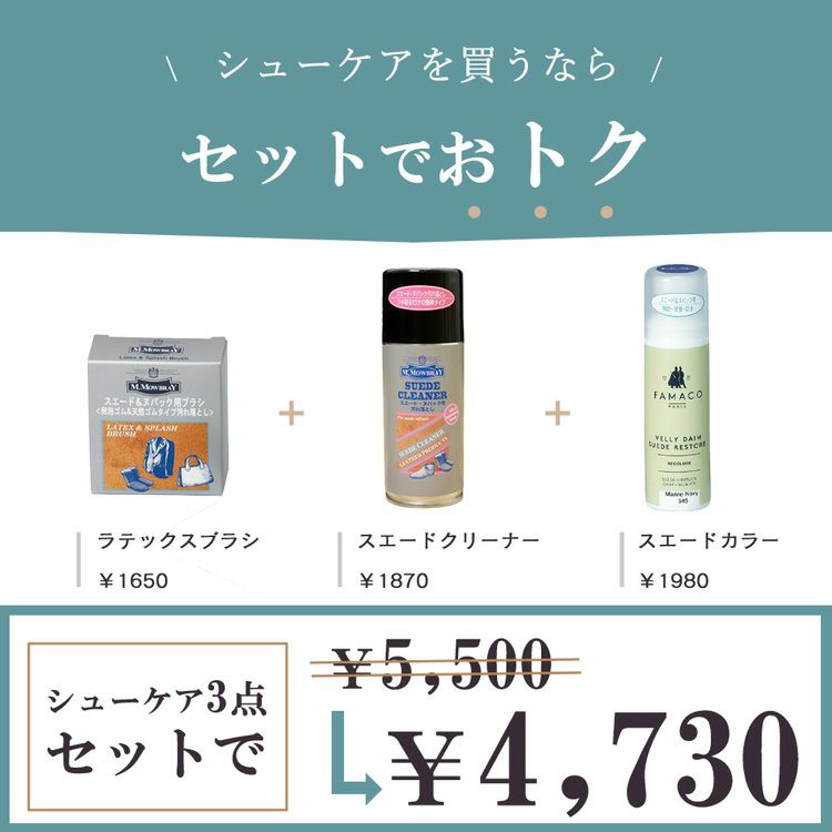 プロユースで評価が高かったケア用品を一般商品化し、さらに日本のファクトリー にて独自製法で開発した商品をラインナップに加えるなど、 品質、伝統、革新をおこなうシューケアブランドとして、M.モウブレイブランドの シューケアプロダクツは日々進化し続けています。