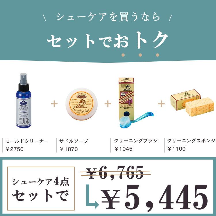 除菌(M.モゥブレィ・モールドクリーナーをスプレー)せずにM.モゥブレィ・サドルソープでクリーニングした場合、カビが大好きな水分が全体に行き渡る事になるので、結果的にカビを靴全体に広げてしまう事になるのでご注意下さい。 カビにも色々な種類があります。薄い色の皮革に発生した黒カビや赤カビはシミとして皮革に定着してしまうものもございます。M.モゥブレィ・モールドクリーナーを使用しても落ちないものもありますので予めご了承下さい。