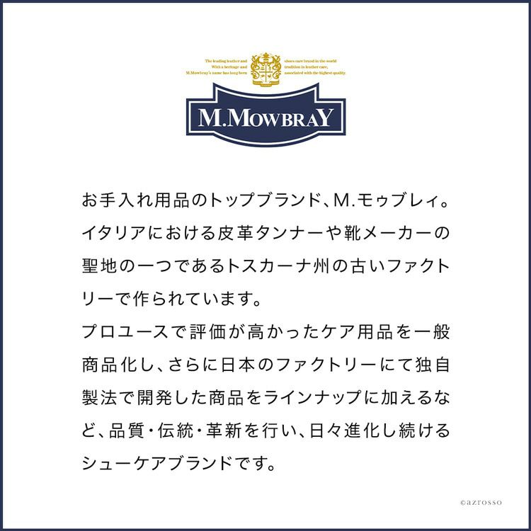 プロユースで評価が高かったケア用品を一般商品化し、さらに日本のファクトリー にて独自製法で開発した商品をラインナップに加えるなど、 品質、伝統、革新をおこなうシューケアブランドとして、M.モウブレイブランドの シューケアプロダクツは日々進化し続けています。