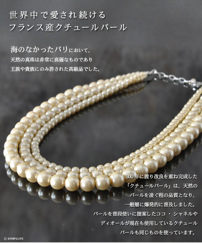 フランス製 3連パールネックレス パールドコタラッテ映画「ココ・シャネル」で使用されたパールネックレス ブランド 真珠 4ミリ 8ミリ セットのピアスも販売中
