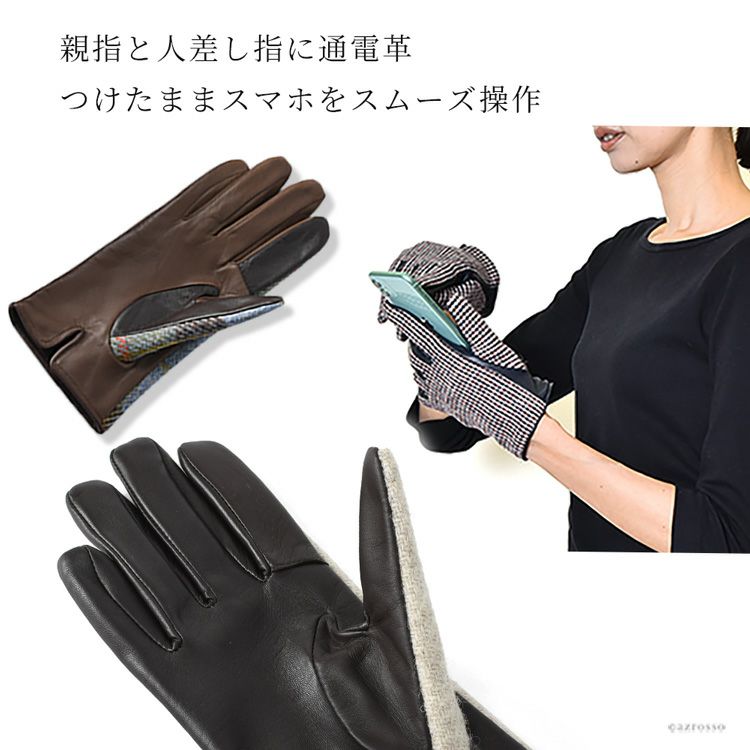 スマホ対応 ハリスツイード×ラムレザー 手袋 チェック柄 レディース レザーグローブ 日本製 手袋 イタリアで大賞受賞の日本ブランド「クロダ」抗菌グローブ【通常ネコポス配送】