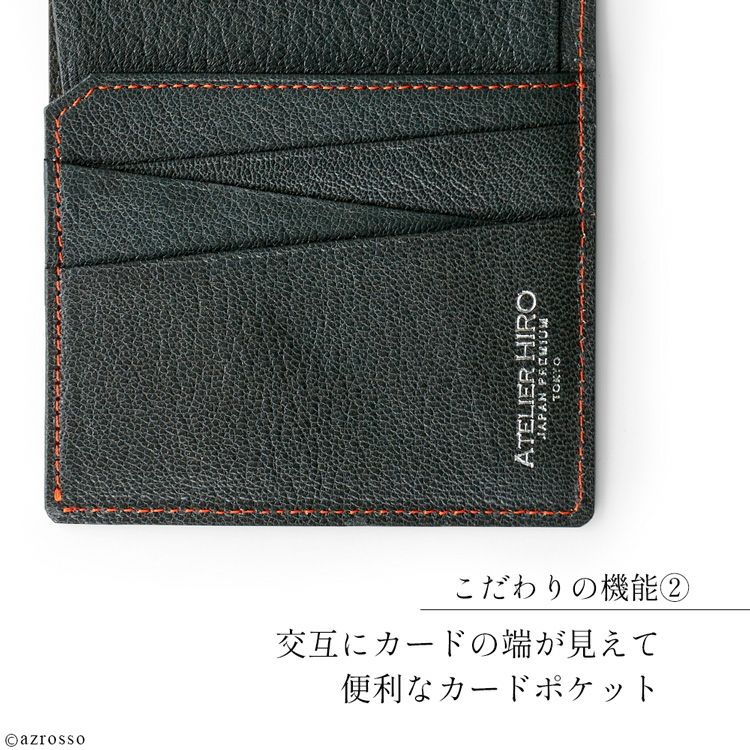 ▼特徴: 財布 サイフ 札入れ 小銭入れ カード入れ マチあり 本革 山羊革 ヤギ革 レザー 二つ折り 二つ折 2つ折り 黒 ブラック 緑 グリーン 青 ブルー オレンジ ステッチ 薄型 薄い 軽い 軽量 スリム