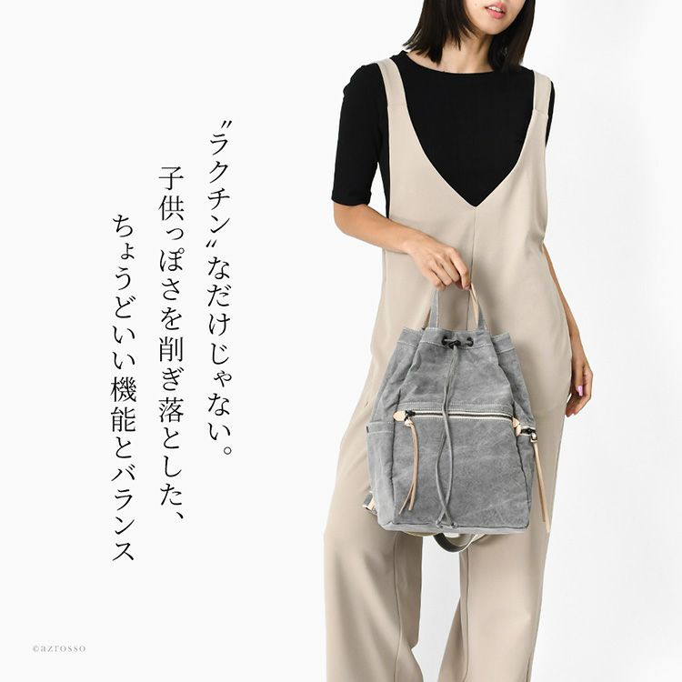 備長炭染め帆布のニュアンスカラーが魅力の日本製リュック。軽量で柔らかな帆布を使用し、大人カジュアルにぴったり。ガバッと大きく開いて中身が見やすい、シュッとワンアクションで簡単に閉じる巾着リュック 日本製 巾着 リュック レディース 軽量 a4 帆布 背面ファスナー直結 サイドポケット付き 大容量 おしゃれ きれいめ 背中 蒸れない 畳める