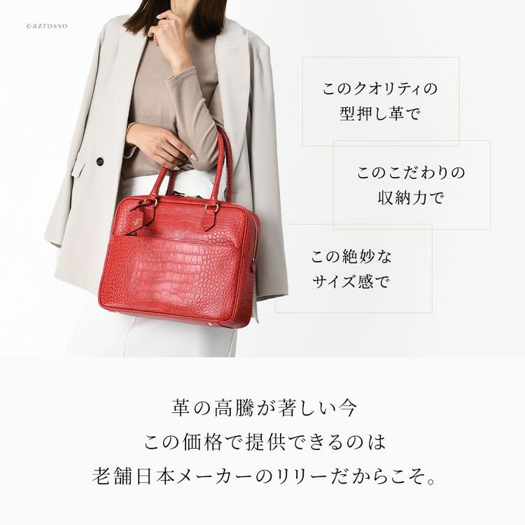 働く女性の要望に応えるクロコ型押しレザートートバッグ。美しい発色の本革に高級感漂うクロコエンボスが施された人気シリーズ。A4対応で使いやすい、通勤 お仕事 出張 外回り 営業におすすめの日本製ビジネスバッグ 日本製 トートバッグ 本革 クロコ型押し ビジネスバッグ A4 2way レディース おしゃれ 底鋲付き 自立 肩掛け可能 大容量