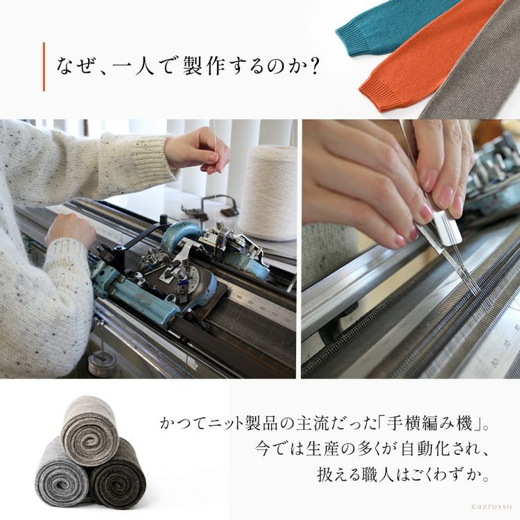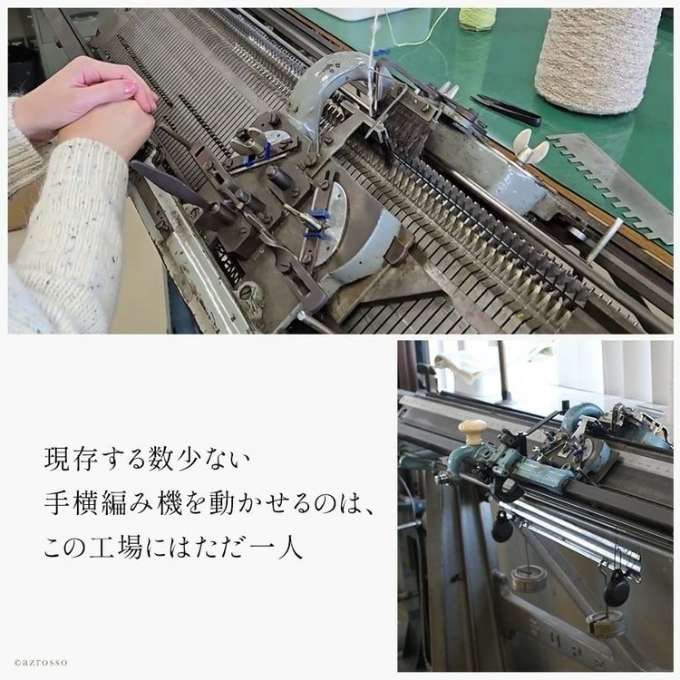 その糸を編み立てるのは、手横編み機を操るたった一人の職人。かつてニット製品の主流だったこの編み機を扱える人は、今では全国でも数えるほどしかいません。職人は糸の力加減や速度を微調整しながら、一段一段を編み上げます。編立からリンキング、縮絨、アイロン仕上げまで、すべての工程を一人で担うため、一日に作れるのはわずか4本だけです。