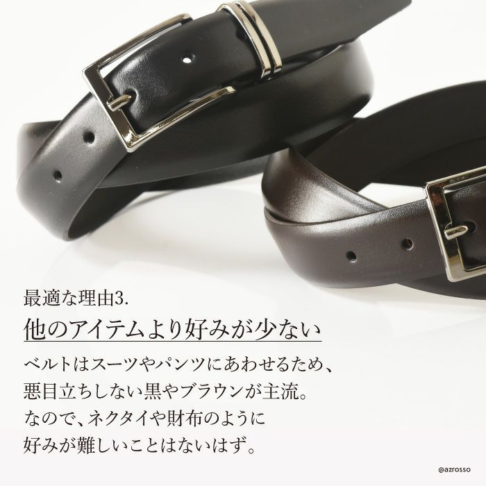 自分ではつい購入を後回しになりがちなベルトは、女性から男性へ、奥様からご主人のへのプレゼントとしてもオススメです。また、サイズ選びに失敗がないこと、他のアイテムより好みが分かれないこともオススメのポイントです。