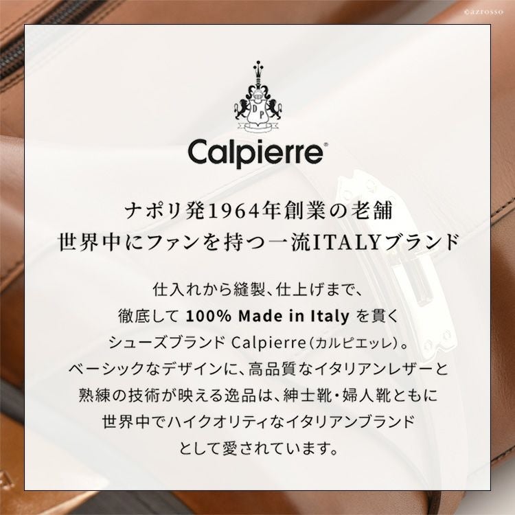 Calpierre(カルピエッレ)は1964年にチーロ・デ・バスカーレがイタリアのエルコラーノ(ナポリ県)で立ち上げた老舗シューズブランドです。 仕入れ、デザイン、縫製、仕上げまで、すべてイタリア国内、現地スタッフによって製造された100%メイド・イン・イタリー。 上質な本革などイタリア産の原材料のみを使用し、熟練した靴職人によってマッケイ製法で丁寧に細部までこだわり抜いて仕上げられた、高品質でデザイン性の高い靴を提供しており、イタリア国内のみならず世界中で多くの支持を得ています。 ベージックなアイテムでありながら、存在感を放つクラシックでエレガントなデザインは大人を満足させれる逸品です。 高級素材と一流の職人技が生み出した、魅惑の靴をぜひご堪能ください。