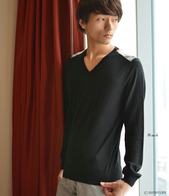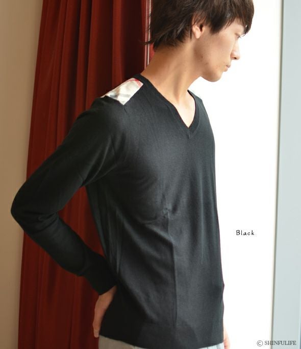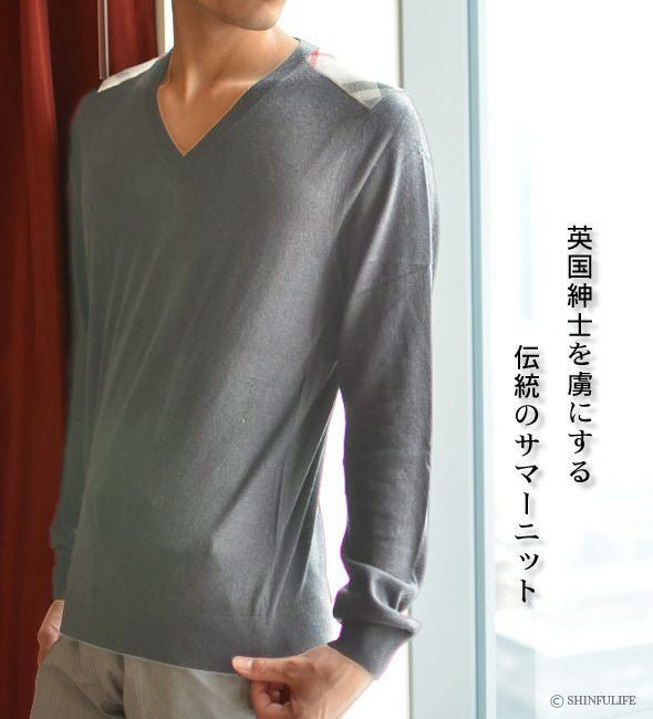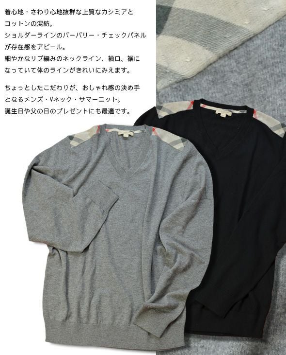 伝統のバーバリーニットをリーズナブルに。メンズ・サマーニット/カシミア/Vネック/肩のバーバリー・チェックが洒脱な印象に/プレゼントにも/BURBERRY/正規品 バーバリー ブリット BURBERRY BRIT Vネック サマー ニット 長袖 メンズ チェック 柄 カシミア コットン