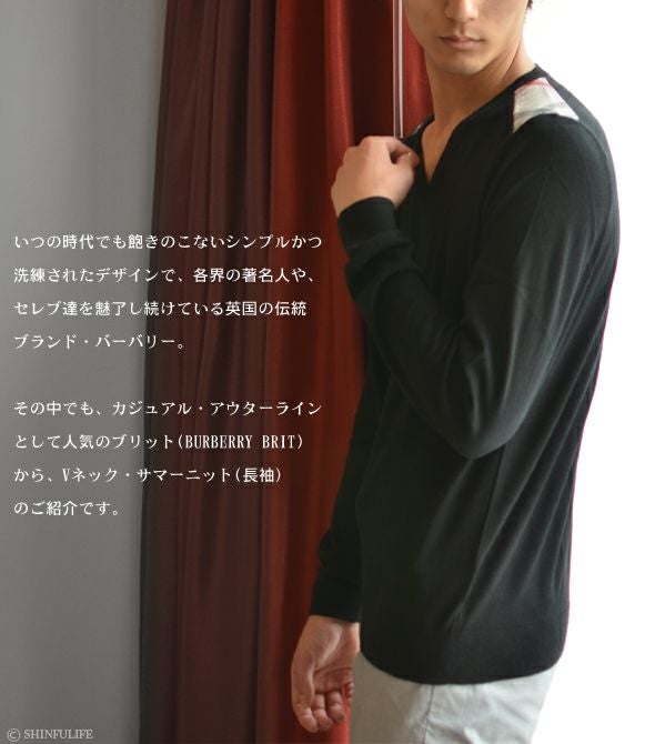 いつの時代でも飽きのこないシンプルかつ洗練されたデザインで、各界の著名人やセレブ達を魅了し続けている英国の伝統ブランド・バーバリー。カジュアル・アウターラインとして人気のブリット(BURBERRY BRIT)から、Vネック・サマーニット(長袖)のご紹介です。
