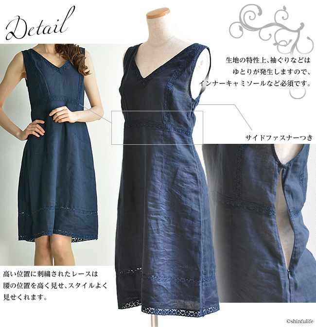 リネン ワンピース 春夏 ノースリーブ ZYGA レディース Aライン 上品 レース 麻 ナチュラル ネイビー ジガ ズィガ zyg1605rbian
