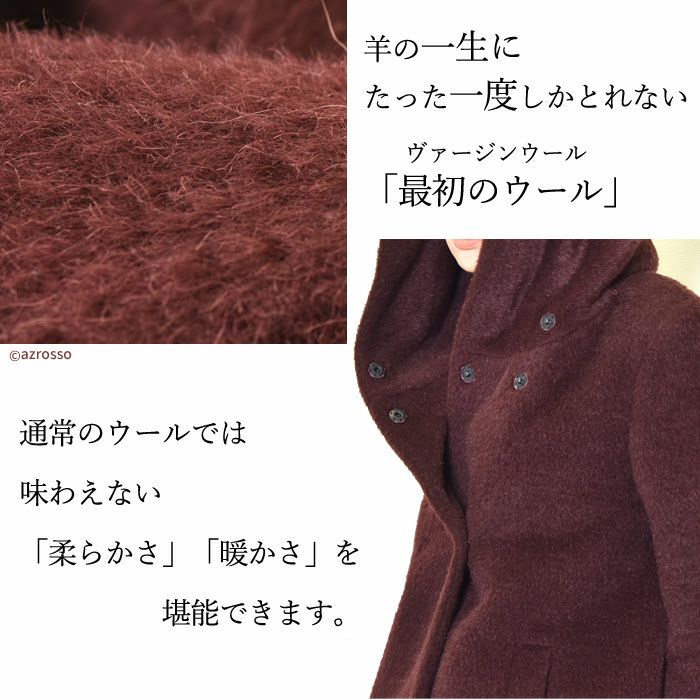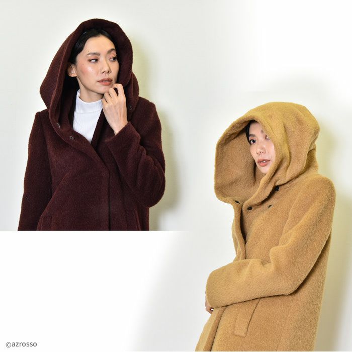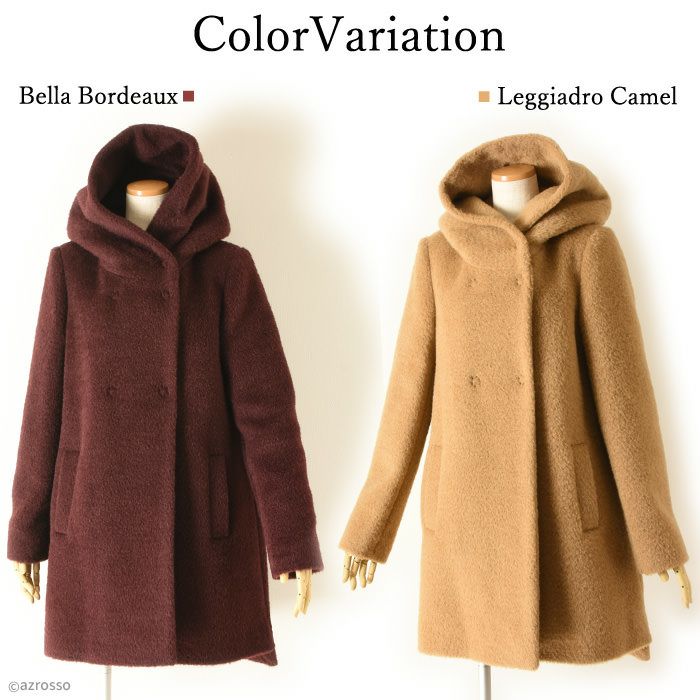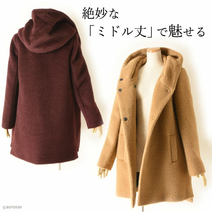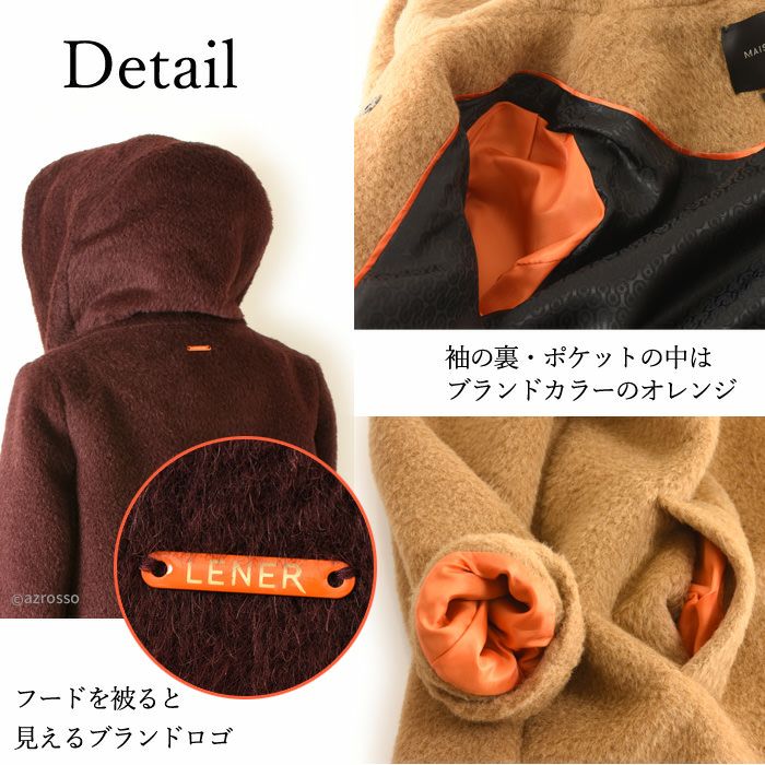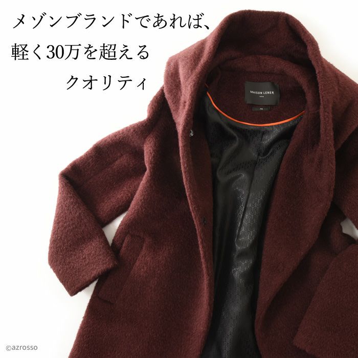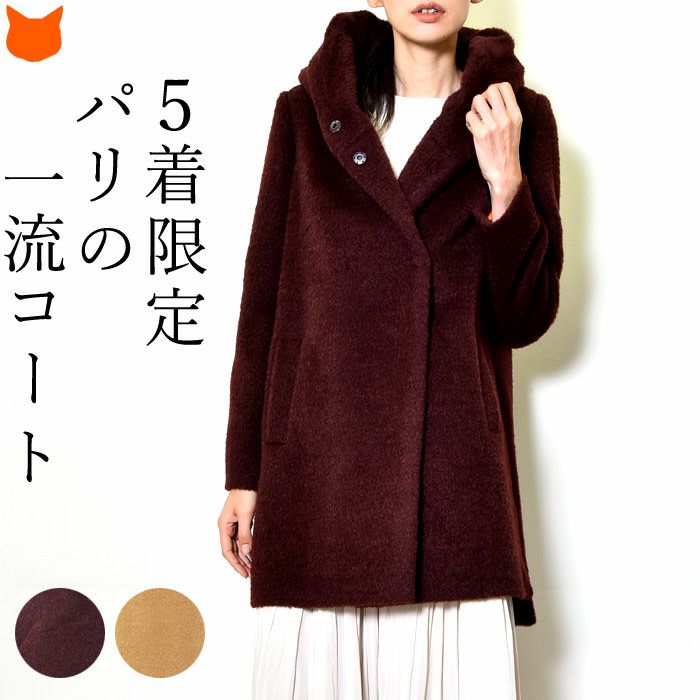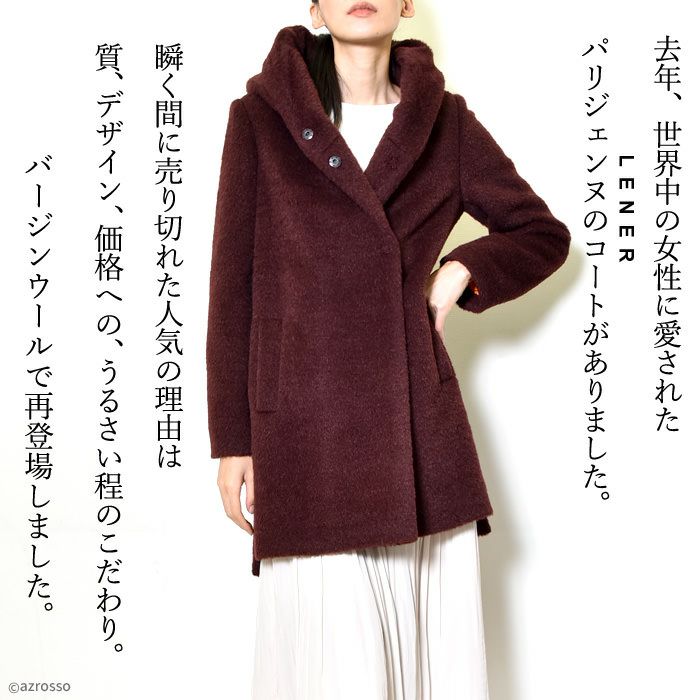 ヴァージンウール ミドル丈コート フード付き レディース シャギーコート ブランド MAISON LENER メゾン レネール キャメル ブラウン ボルドー ワイン