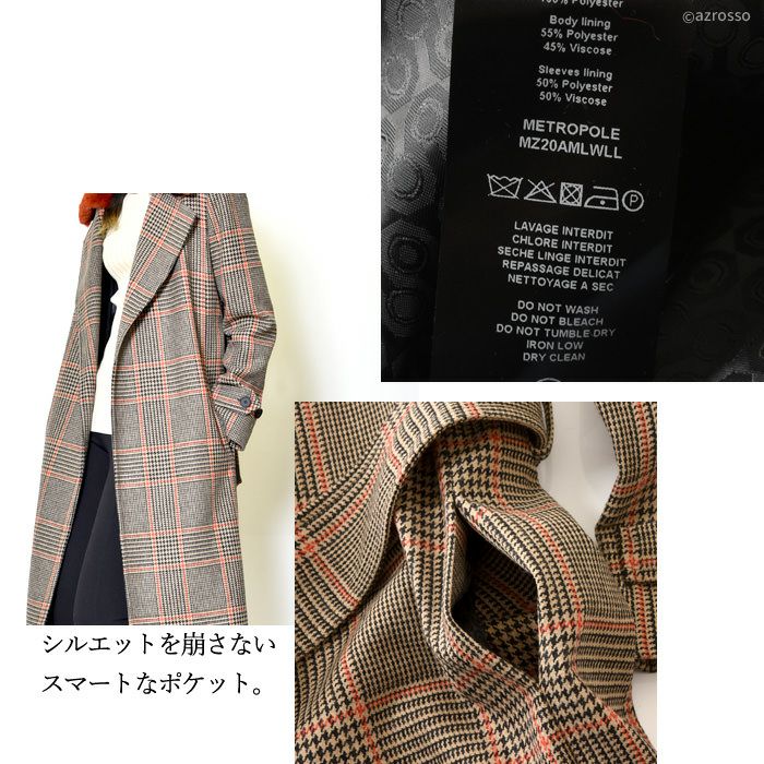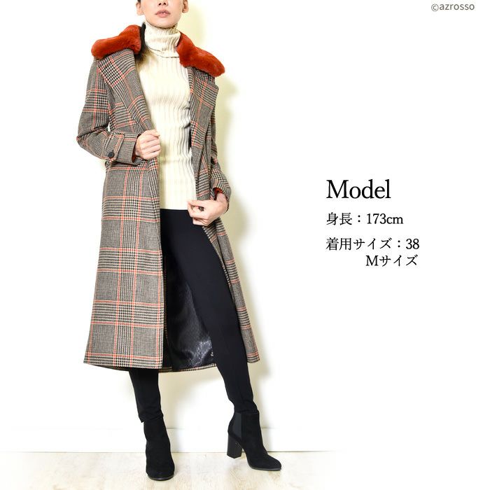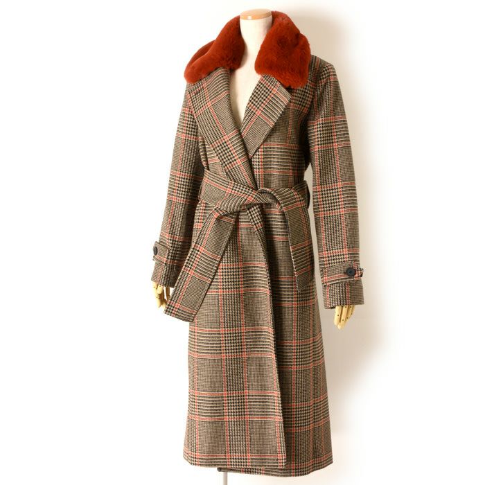 フランス パリの高級コート専門ブランドLENER(レネール レネル)のウール仕立てのラップコート。取り外せるエコファー付き。大きめサイズもご用意。秋冬のお出かけ 旅行 通勤に チェック柄 ラップコート ウール ロングコート レディース リバーコート ガウンコート フランス製 ブランド MAISON LENER メゾン レネール エコファー付き