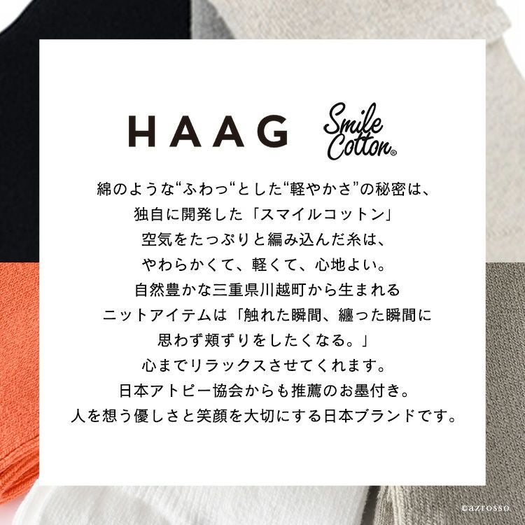 そのスマイルコットン社のファクトリーブランドである「HAAG(ハーグ)」。“Hug、Airy、Ageless、Genderless”をコンセプトに、敏感肌や肌への刺激を軽減したい方に向けて、2012年よりデイリーウェアを中心に提案しています。