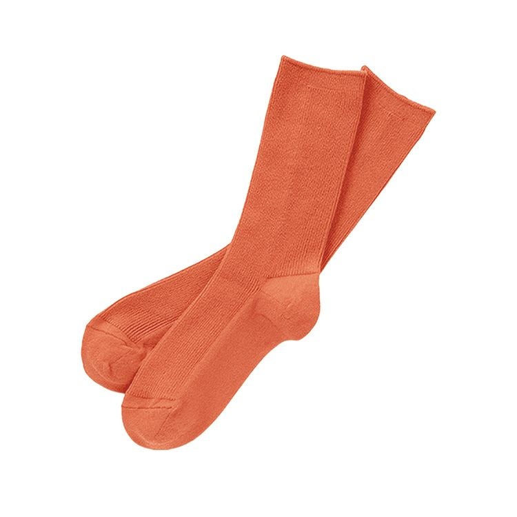こちらの靴下は、1×1リブで履き口はあまり締め付けのないようにルーズな雰囲気に仕上げているので、締め付け感のない優しい履き心地。 ベーシックカラーのホワイト、ウォールグレー、ネイビー、挿し色にも最適なオレンジの4色展開です。