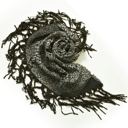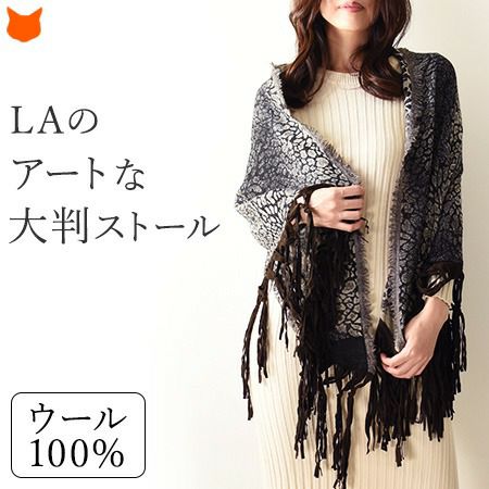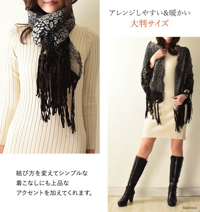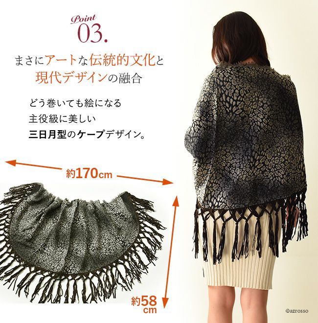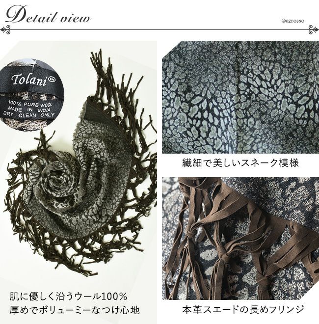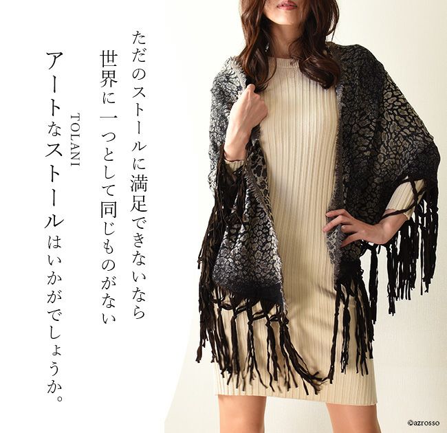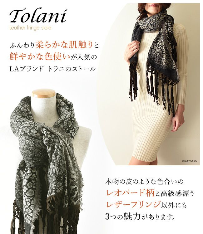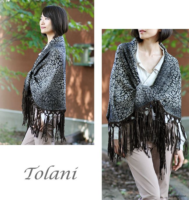 繊細な発色にうっとりTolani (トラニ)レオパード柄レザーフリンジ 大判ストール/三日月型ケープ/ウール/ショール/厚手/巻き方/結び方/敬老の日/ Tolani (トラニ)レオパード柄レザーフリンジ 大判ストール