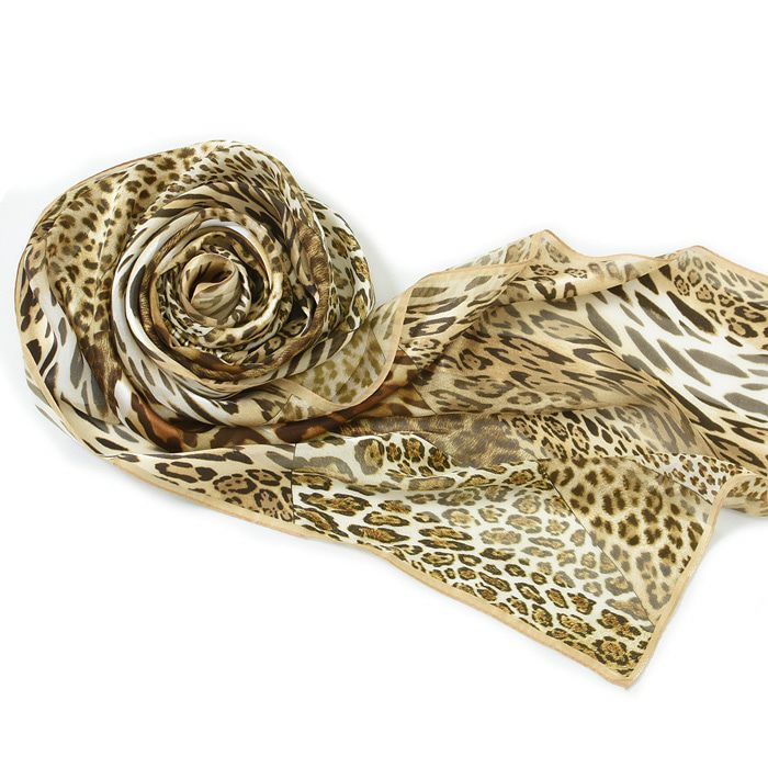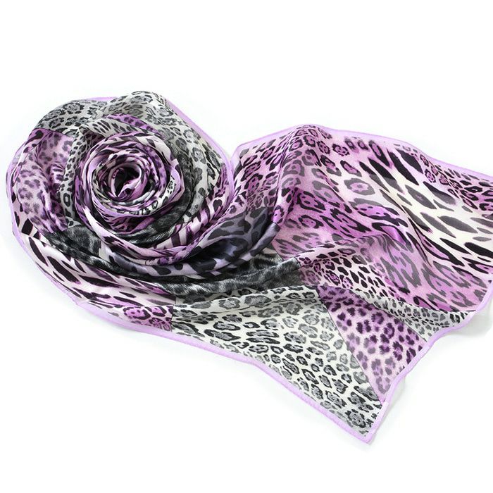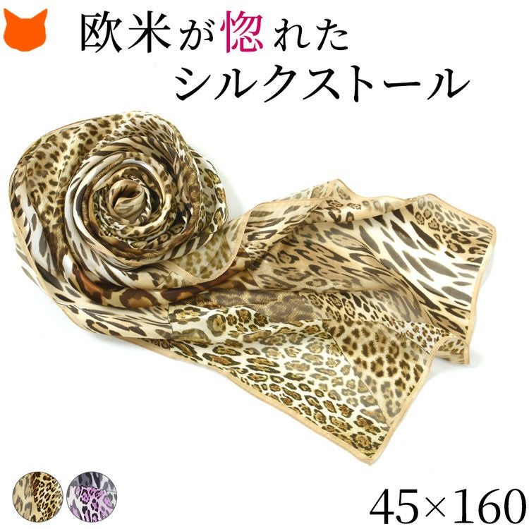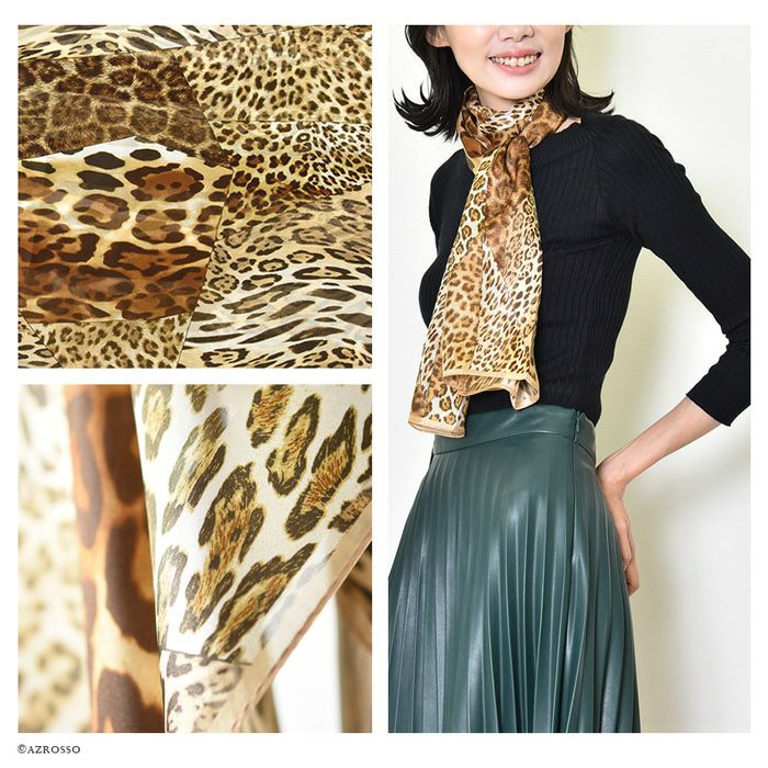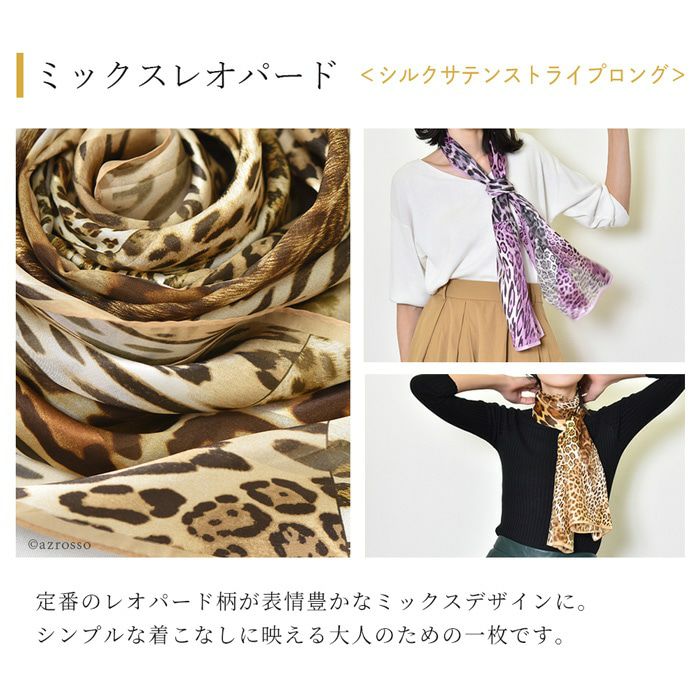 横浜スカーフのミックスレオパード。上質なシルク100%の日本製の長方形大判ストールはベルトやバッグチャームとして巻くのも可愛い。お母さん 彼女 妻(奥さん)へのお祝いのプレゼントや記念日 誕生日ギフトに/ シルク ストール 大判 サテン アニマル ヒョウ 柄 レオパード 43x158 長方形 日本製 ブランド