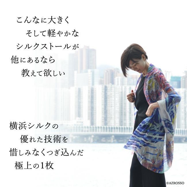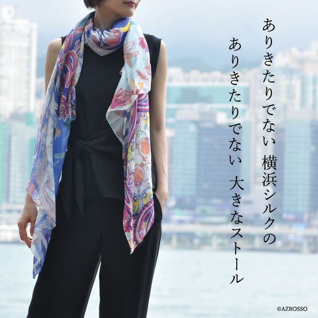 横浜スカーフブランド .Y ドットワイ 大判ストール ショールとして使える大きいサイズ。薄くて軽い、コンパクト収納できるから、結婚式、旅行におすすめ 港と丘の街オークランド 超大判ストール 100×200 シルク レクセル 日本製 ベージュ ブルー オレンジ 冷房対策や紫外線対策に重宝