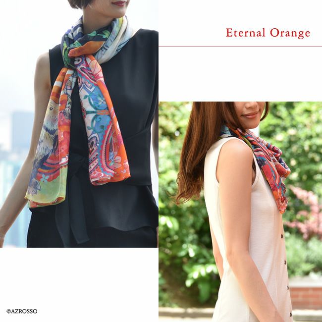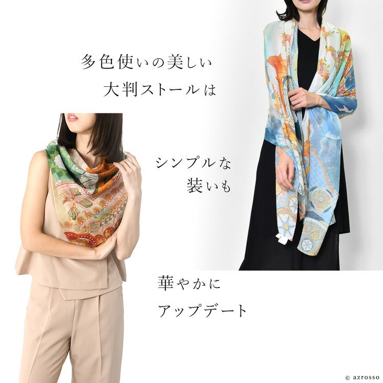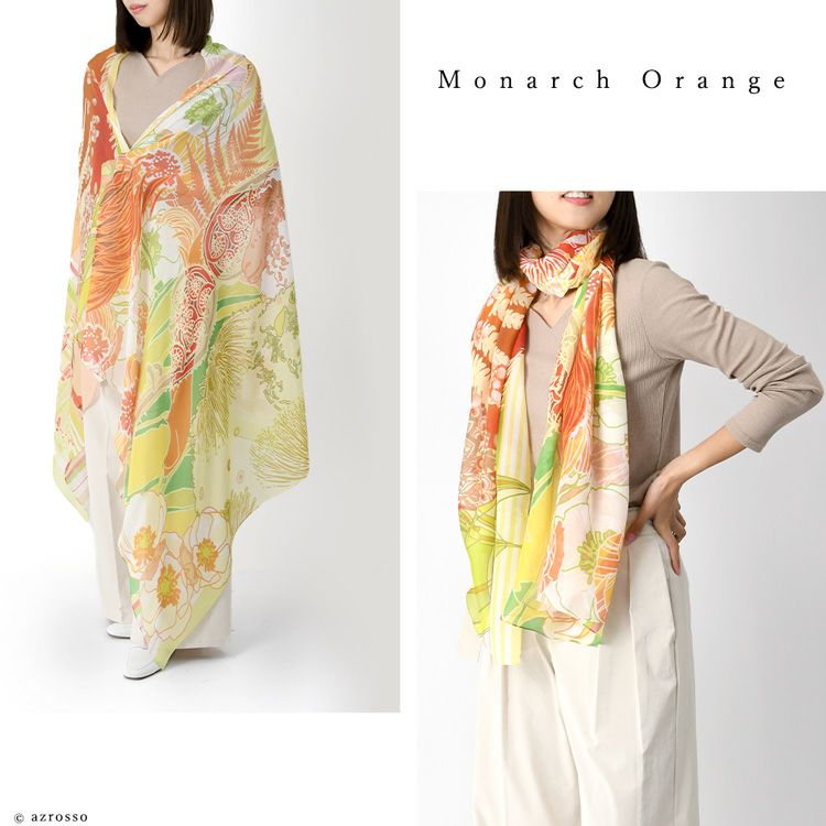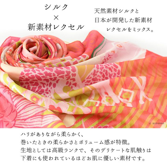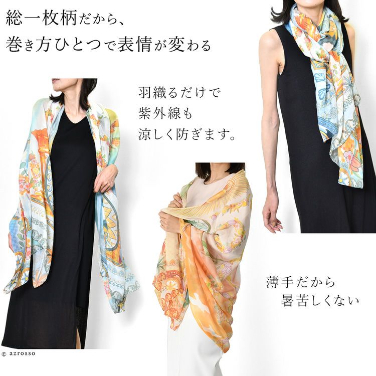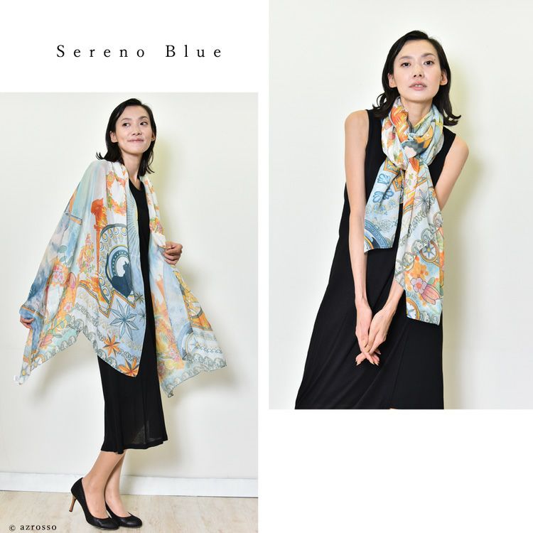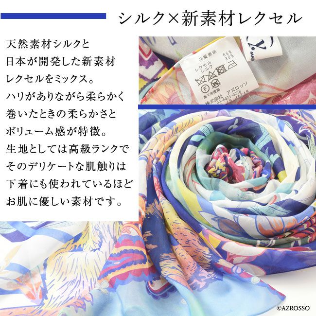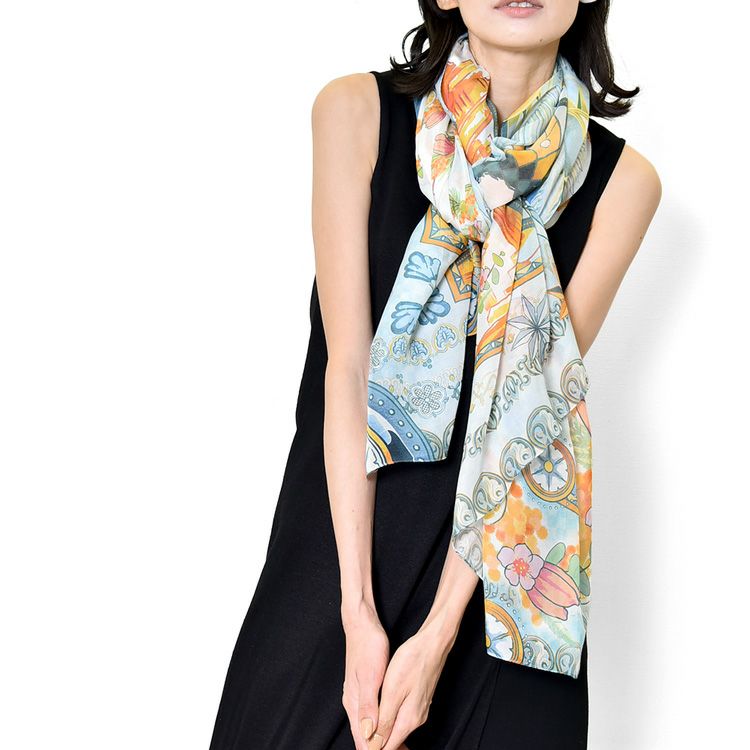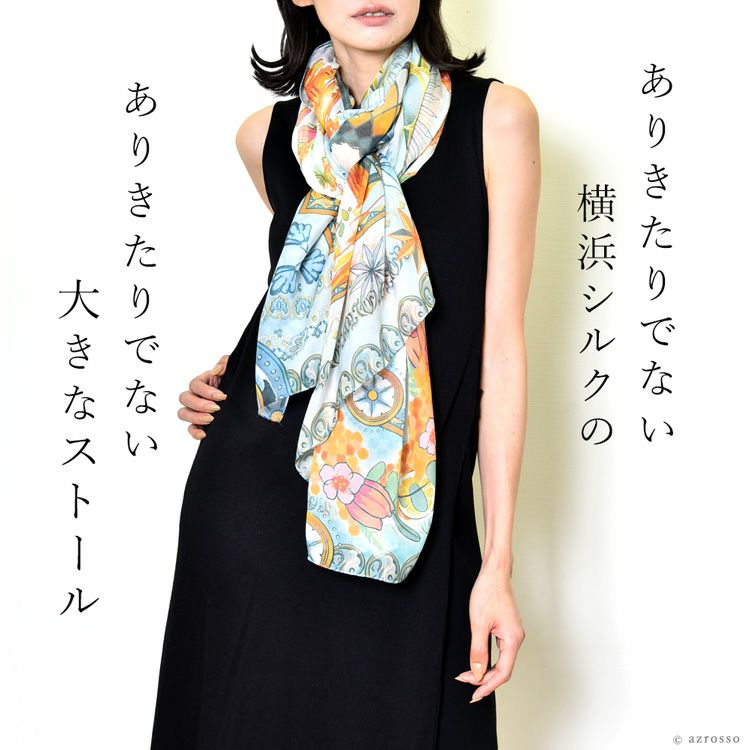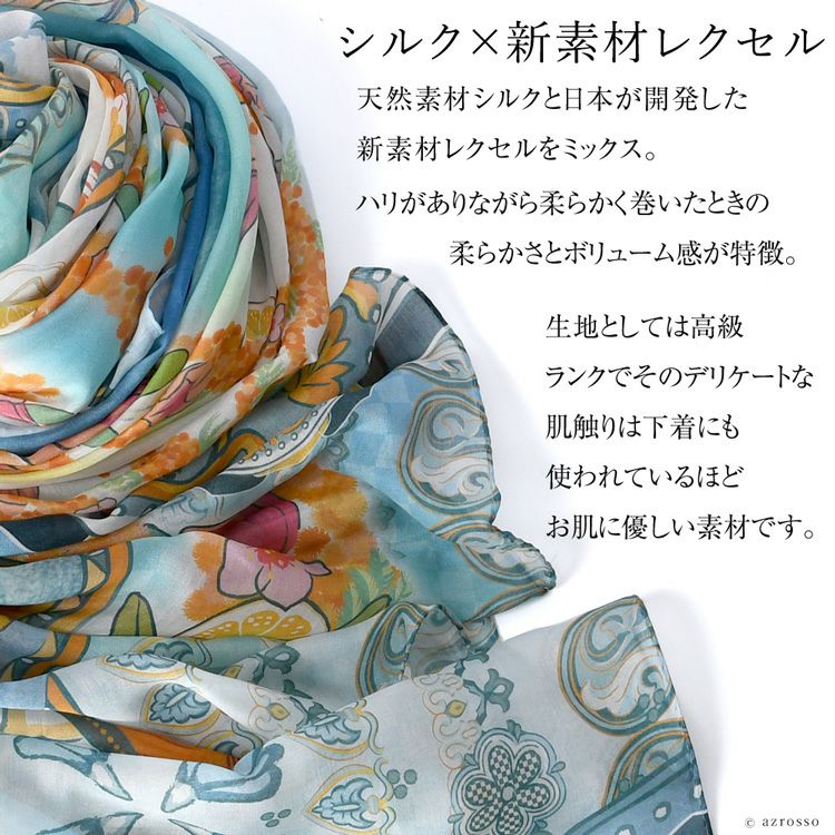横浜スカーフブランド .Y ドットワイ ストール ショールとして使える大きいサイズ。薄くて軽い、コンパクト収納できるから、結婚式、旅行におすすめ 華めく繁栄のビーバー 超大判ストール 100×200 シルク レクセル 日本製 ブルー オレンジ 冷房対策や紫外線対策に重宝