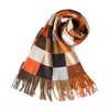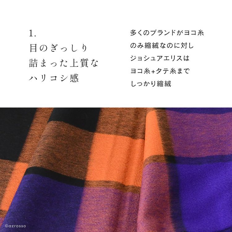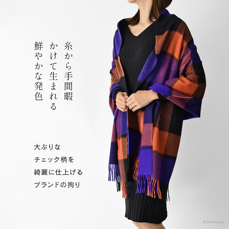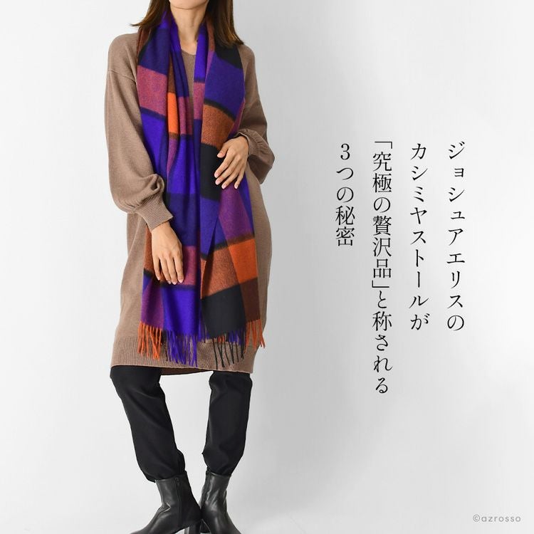 伝統・デザイン・品質、いずれにおいても極上といえるJoshua Ellis(ジョシュア エリス)の最高級品質のカシミヤ100%ストール。パープル×レッドオレンジのブロックチェック柄がおしゃれな大判ストール カシミヤ ストール 大判 厚手 ブロックチェック カシミヤ100% ロングマフラー フリンジ パープル オレンジ レディース ブランド