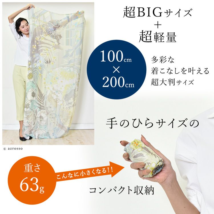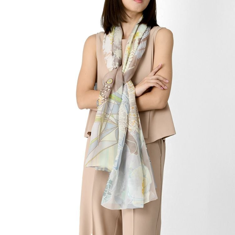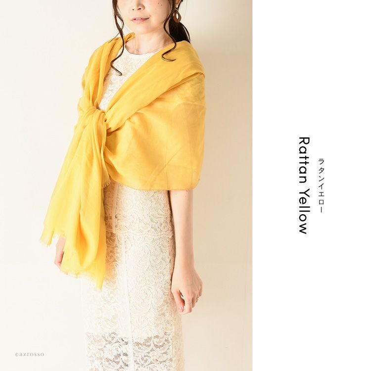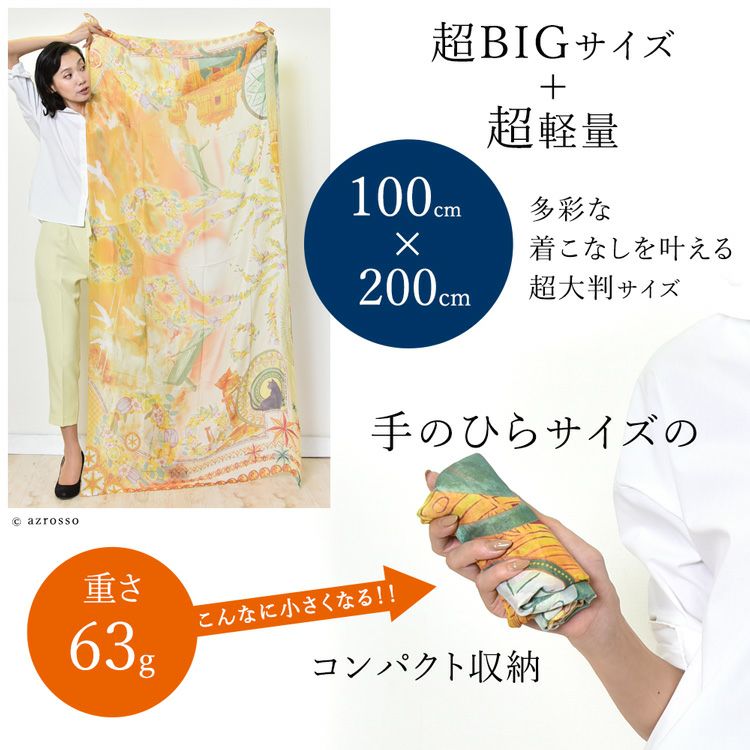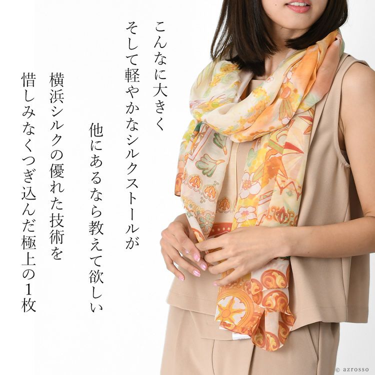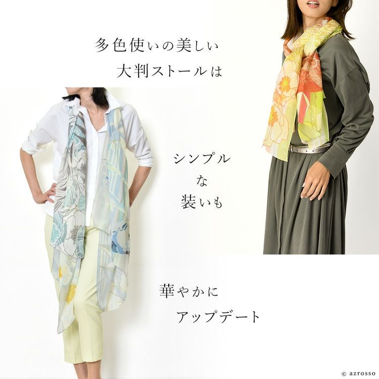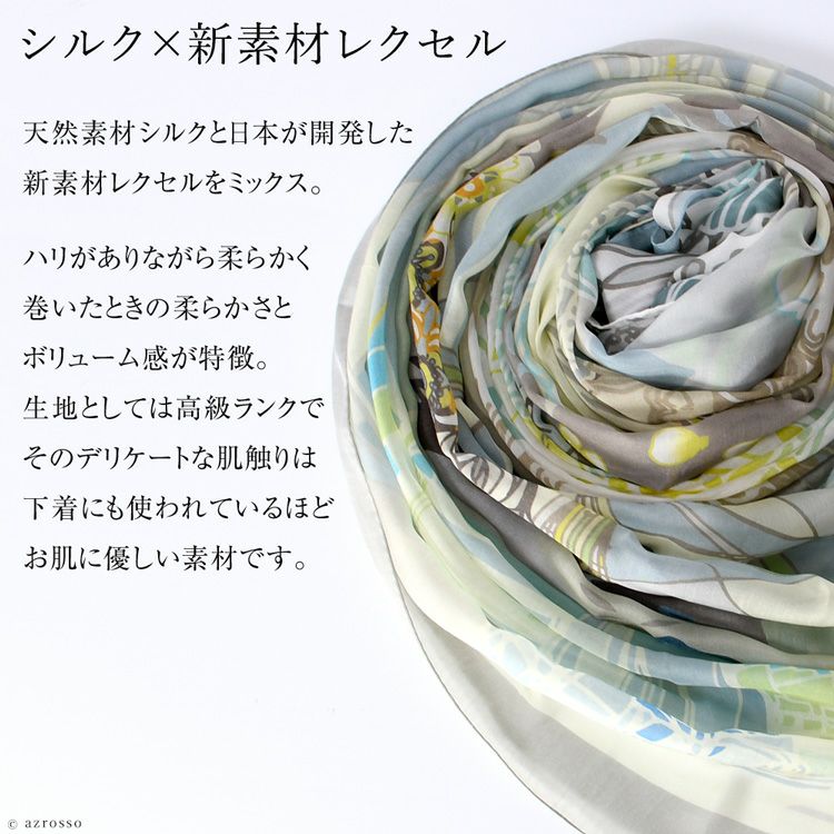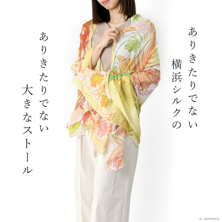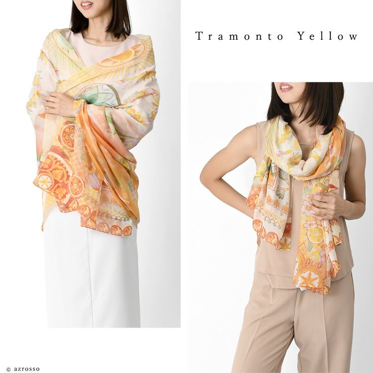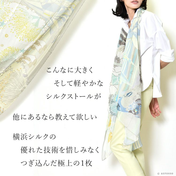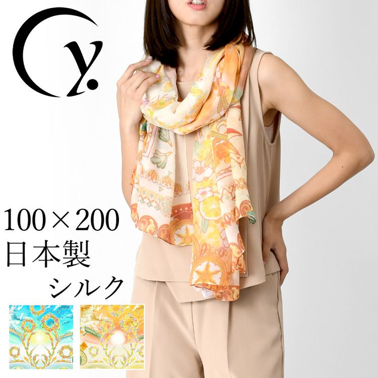 横浜スカーフブランド .Y ドットワイ ショールとして使える大きいサイズ。薄くて軽いから使いやすい、コンパクト収納できる。結婚式、旅行におすすめ ミモザ舞うシチリア 超大判ストール 100×200 シルク レクセル 日本製 ベージュ ブルー オレンジ 冷房対策や紫外線対策に重宝