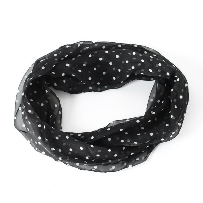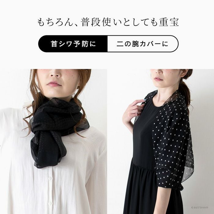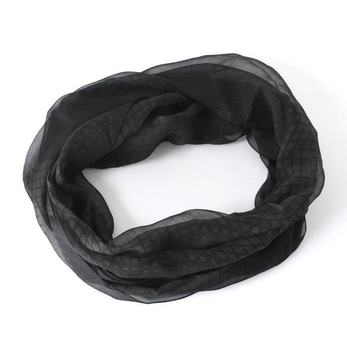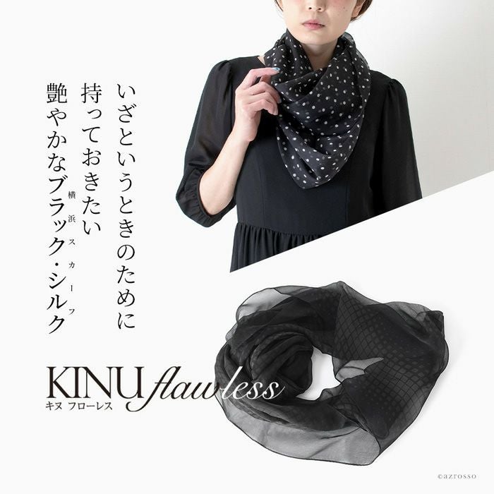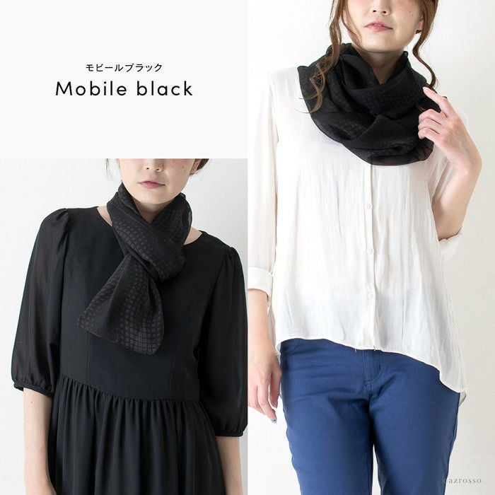 ループ(輪っか)タイプなので簡単装着。冠婚葬祭(法事 お通夜 お葬式 弔事 慶弔 フォーマル)、普段使いに大活躍の黒のシルクストール。お母さん おばあちゃんへのプレゼントにも最適な横浜スカーフ ブラック ループストール 横浜スカーフ ドット柄 モビール柄 日本製 シルクストール ロング ストール 黒 シルク100% 45×80cm【通常ネコポス配送】