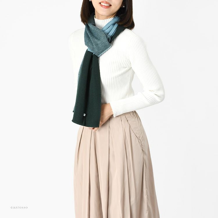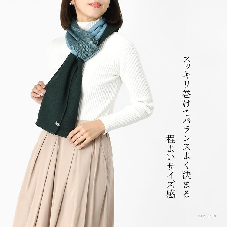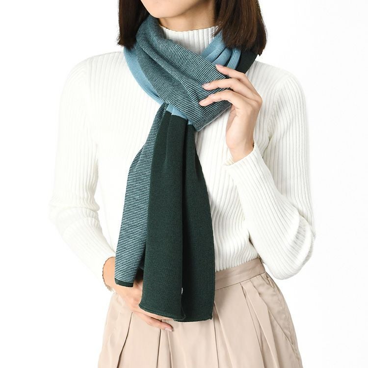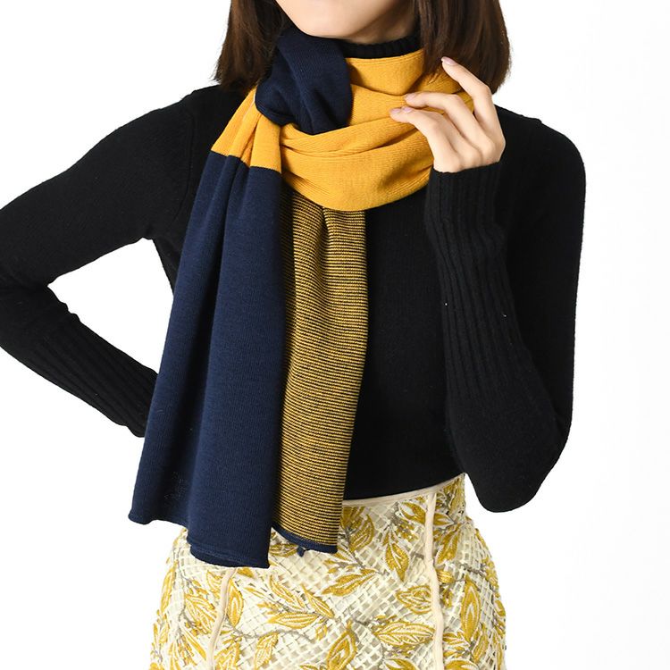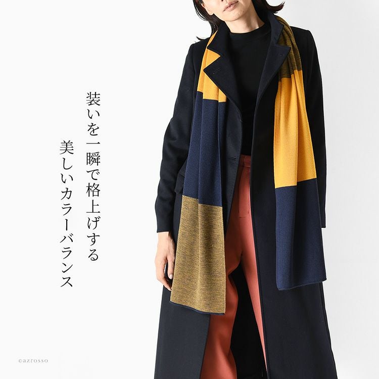 フランス製の上質なウール混ニットマフラー。秋冬コーデを華やかに彩るイエロー×ネイビー・ブルー×グリーンのおしゃれなバイカラーデザイン。ちくちくしないロングマフラーは、大切な女性へのプレゼントにも最適。 ニット ロングマフラー ウール混 バイカラー フランス製 ブランド ちくちくしない レディース 185×35 MAISON BONNEFOY メゾンボンヌフォア
