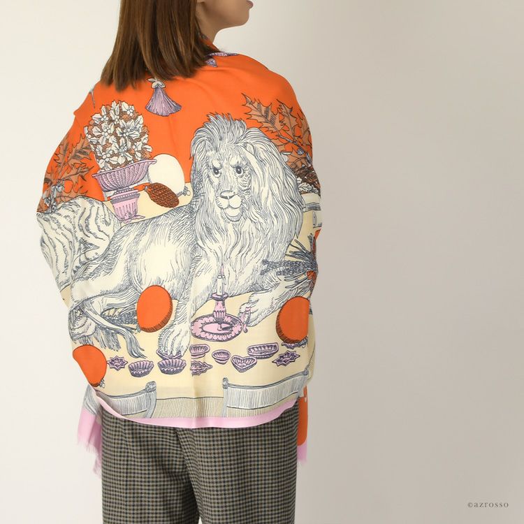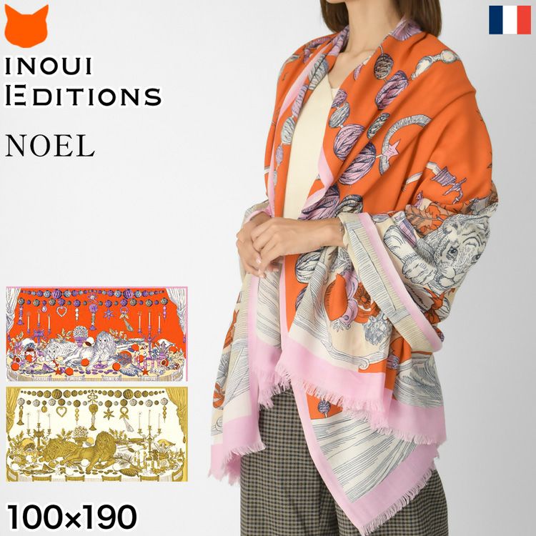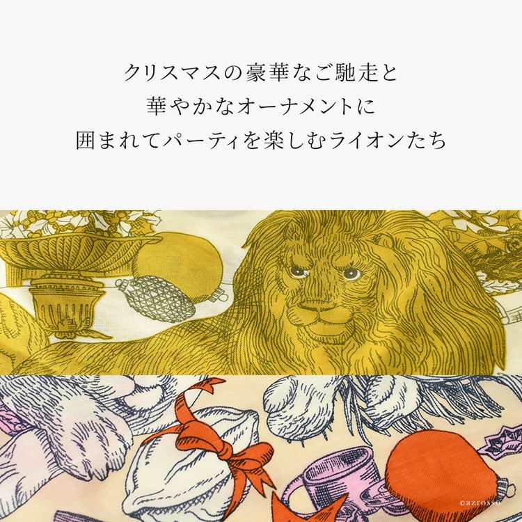 クリスマスの豪華な料理と華やかなオーナメントに囲まれてパーティを楽しむライオンとトラが描かれたおしゃれな大判ストール。フランス INOUI EDITIONS(イヌイエディションズ)のウール×カシミヤストール イヌイエディションズ ストール NOEL INOUI EDITIONS ウールカシミヤ ライオンパーティ