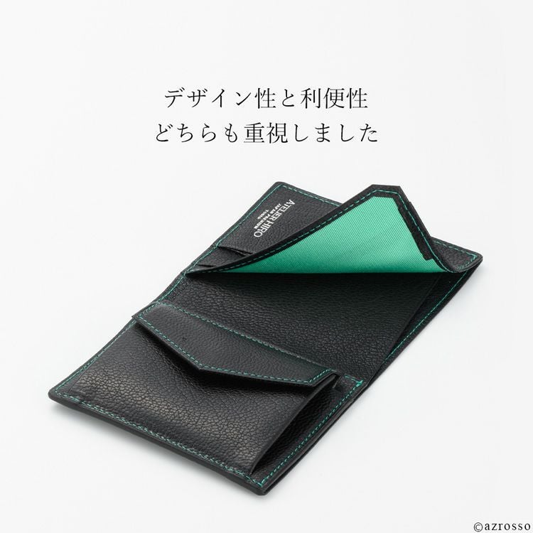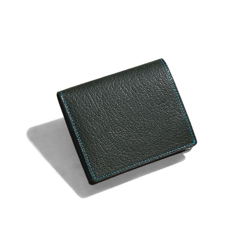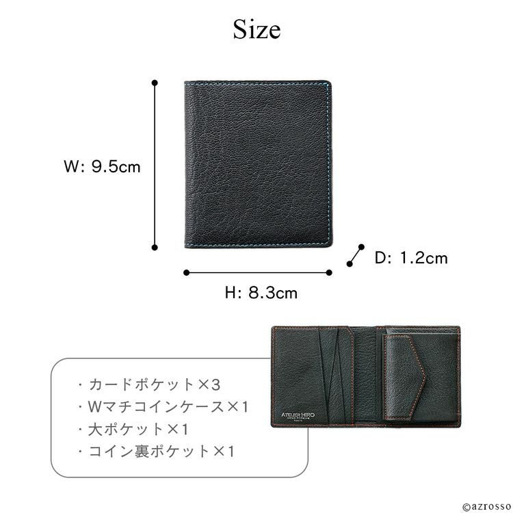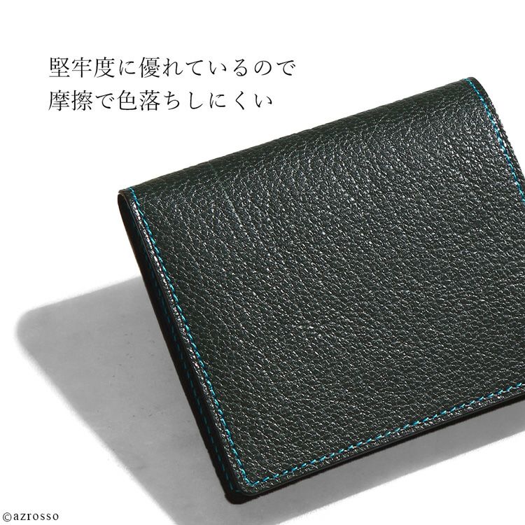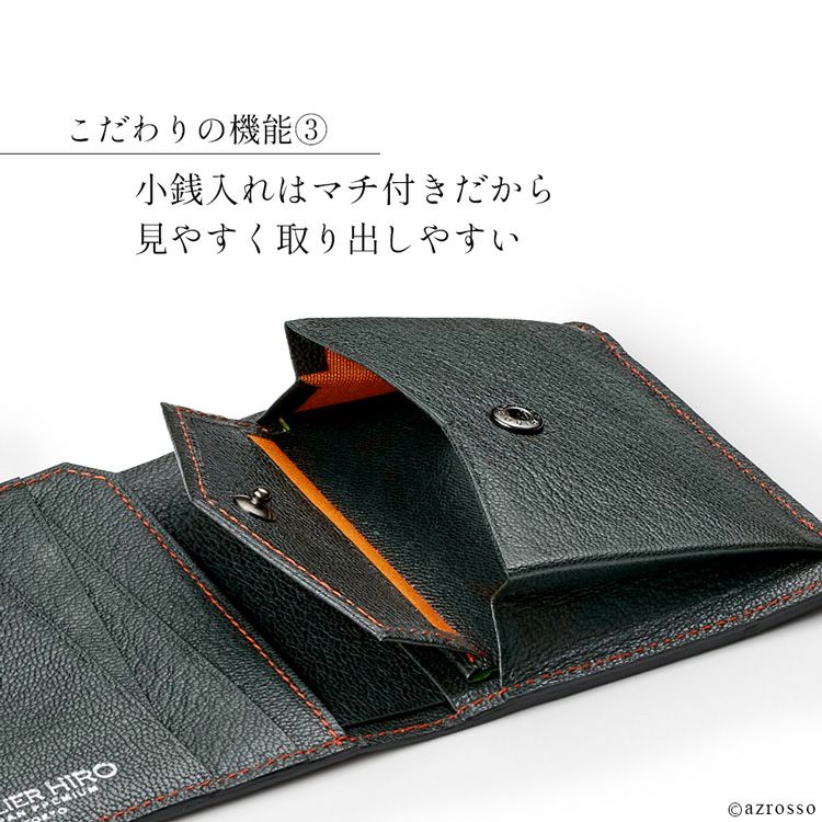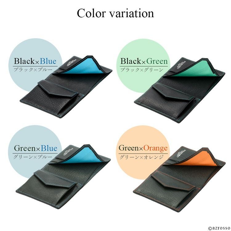 ▼特徴: 財布 サイフ 札入れ 小銭入れ カード入れ マチあり 本革 山羊革 ヤギ革 レザー 二つ折り 二つ折 2つ折り 黒 ブラック 緑 グリーン 青 ブルー オレンジ ステッチ 薄型 薄い 軽い 軽量 スリム