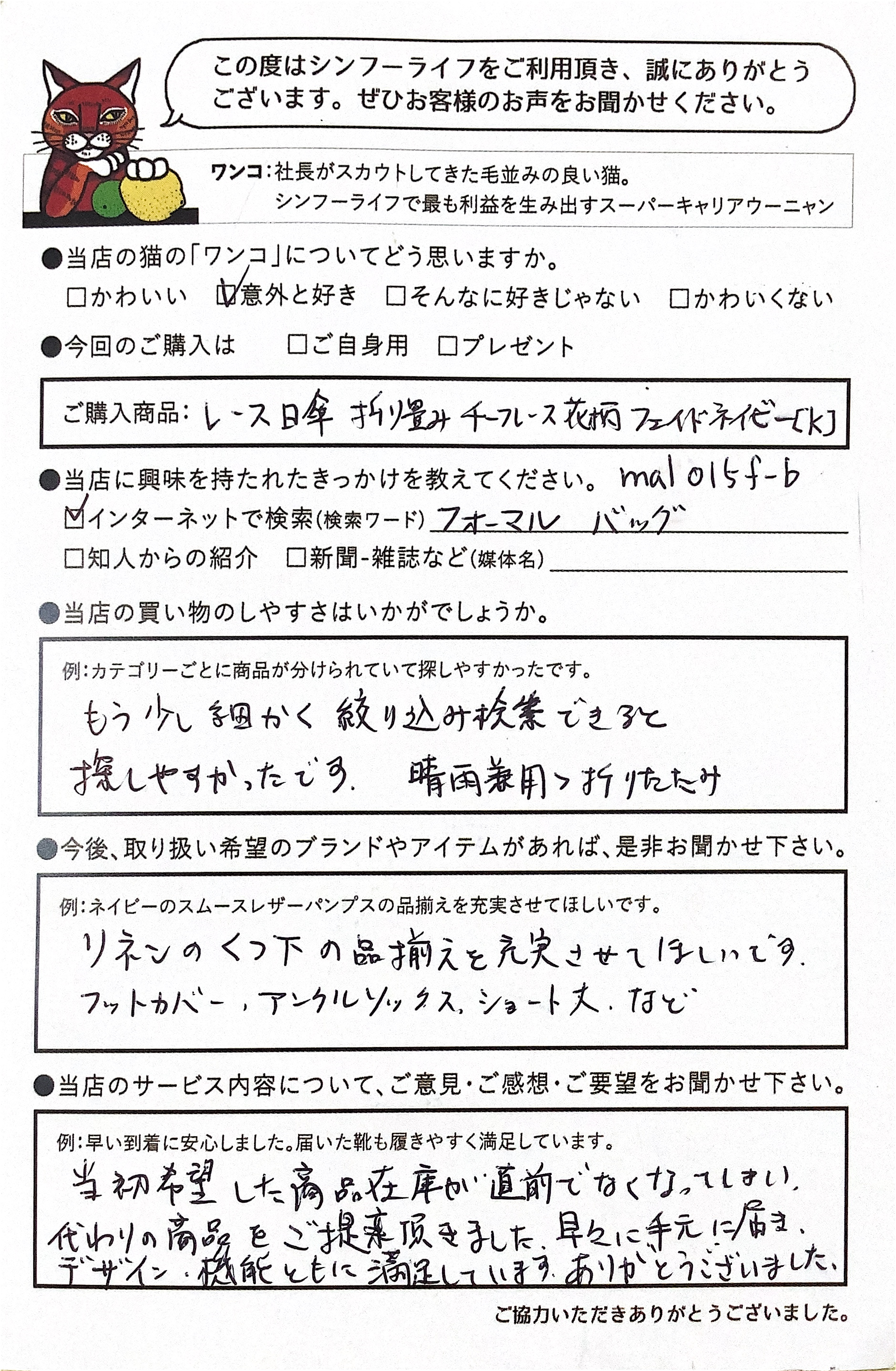 | ご購入日:2024/10/6 J.N様 三重県 女性 お声を頂いた商品: 京都老舗が監督、ブラックフォーマルのマナーに合わせてデザインした法事用ハンドバッグ 買い物のしやすさもわかりやすかった。 厚底ストレッチ6pヒール ブラックシューズが欲しい。 |