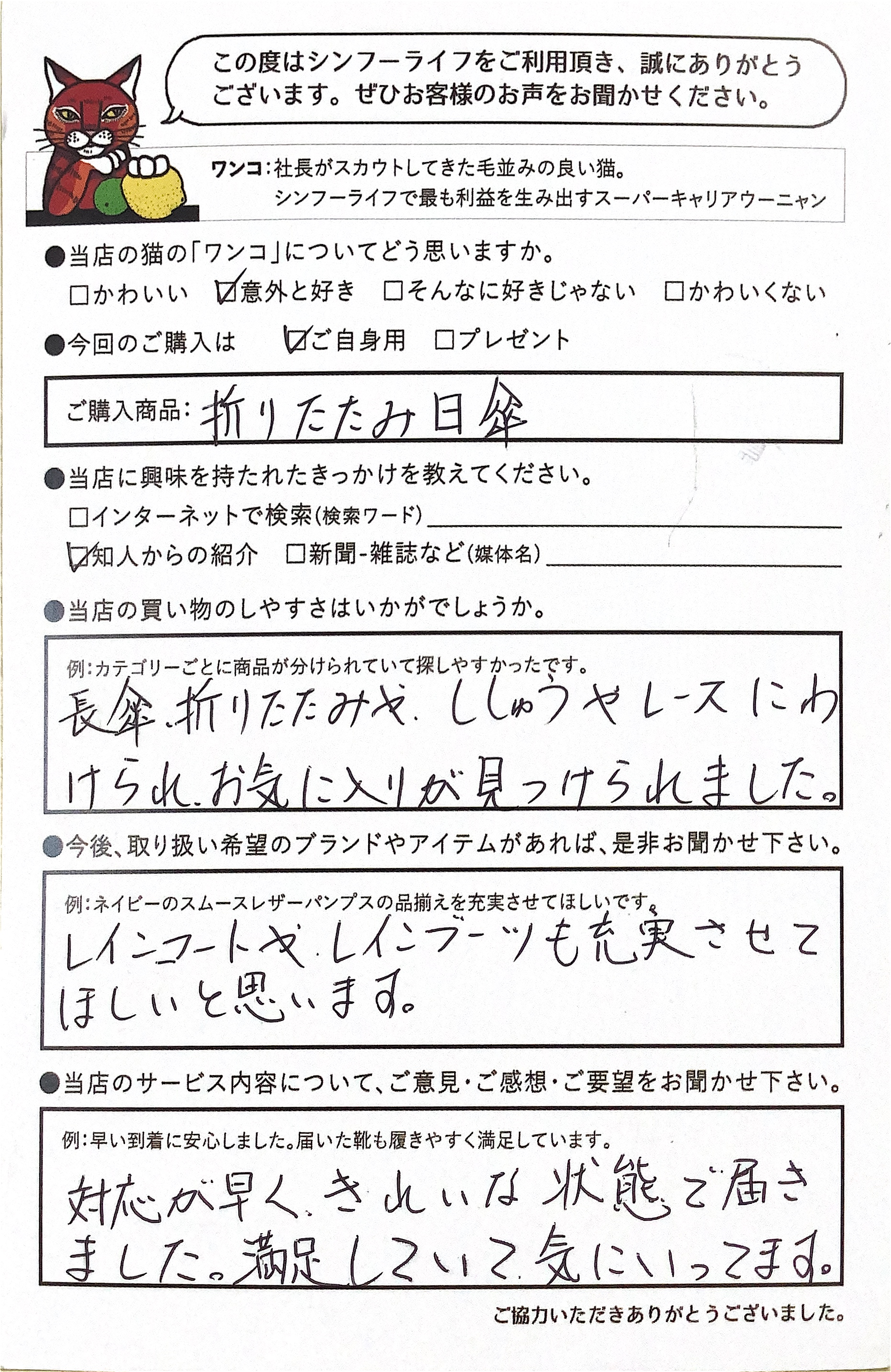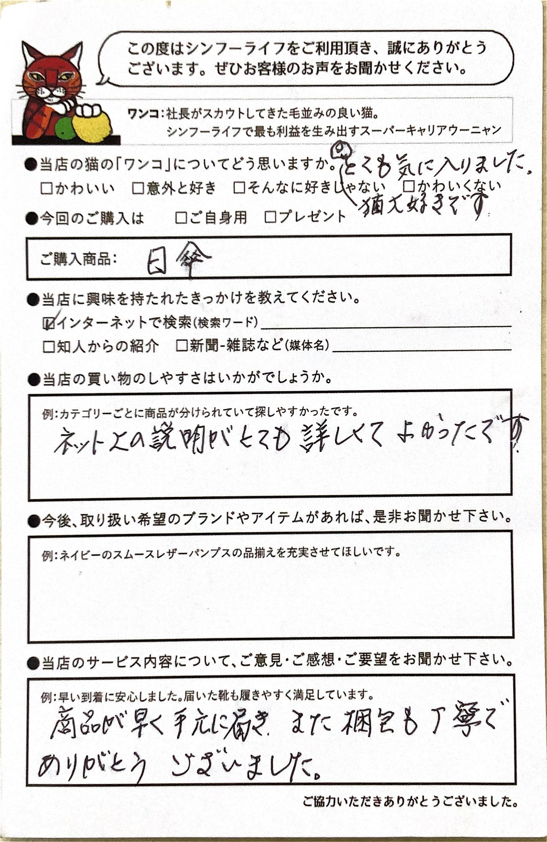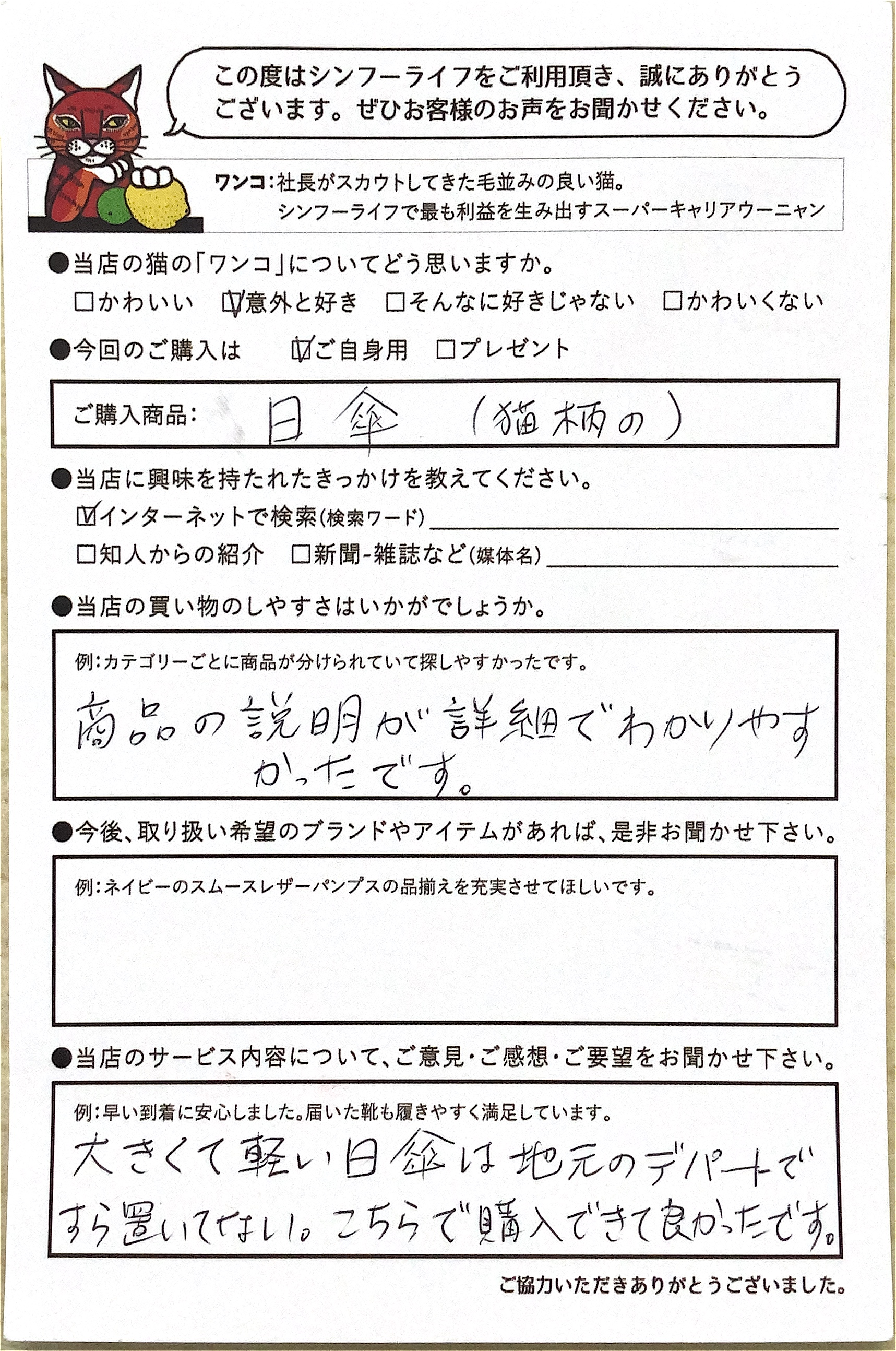 | 埼玉県 お声を頂いた商品: 日傘 小物等は明るい色やパッと目を引く原色の物があったら心躍ります。 良い品がたくさんあり、見ているだけで楽しくなります。 また、同封のお手紙や義日メールを読ませて頂き嬉しい気持ちになりました。 |