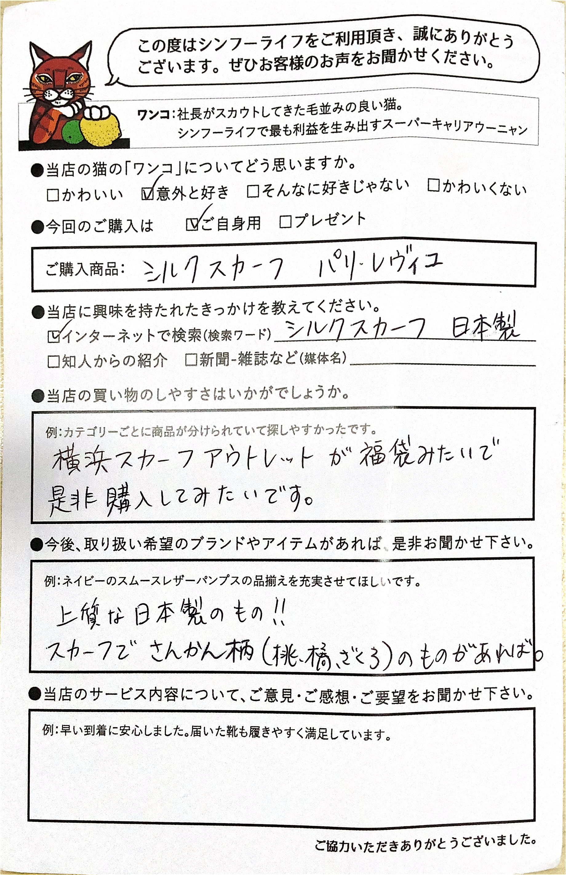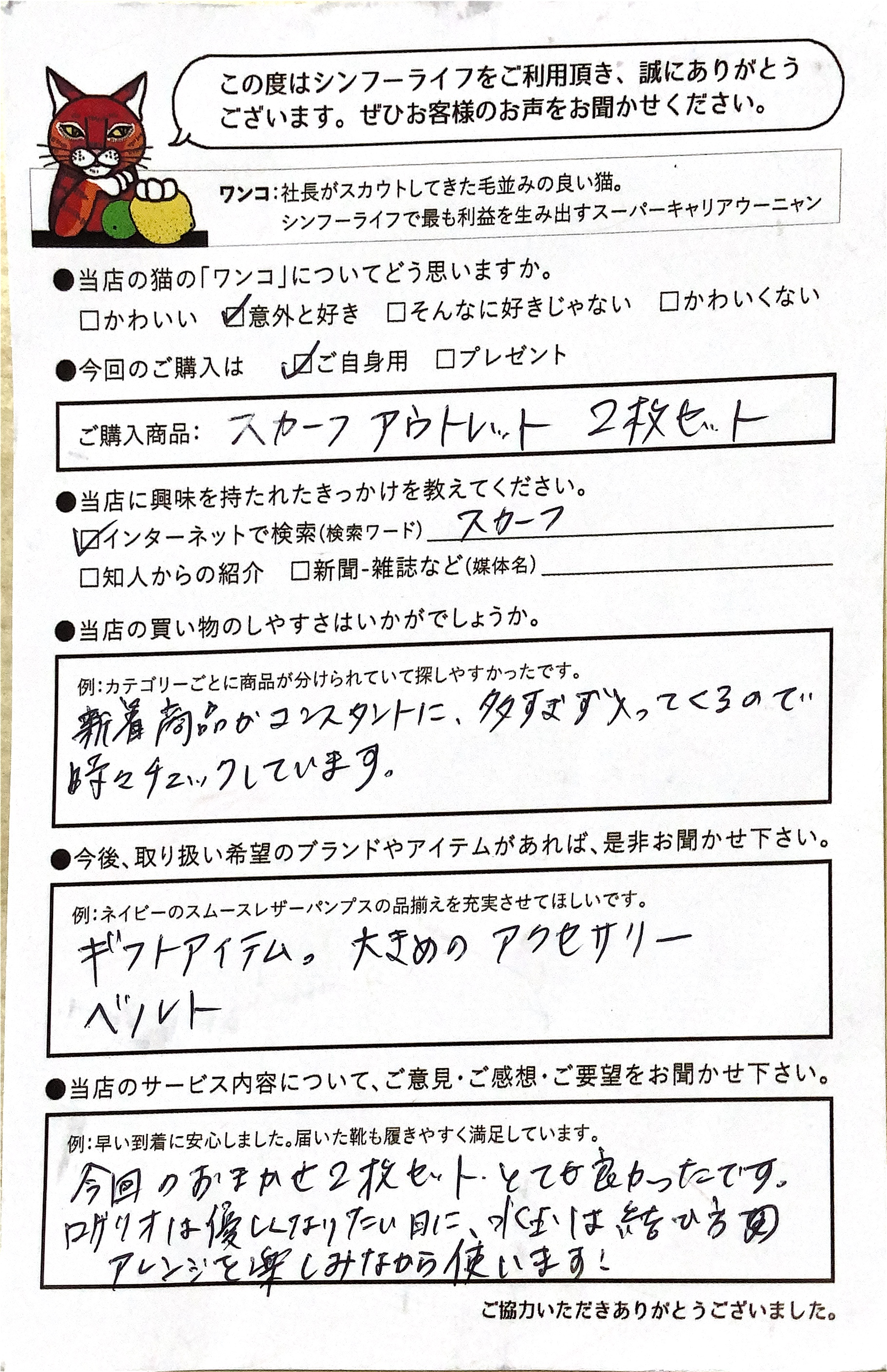 | 2018/06/07 Y.M様 東京都 女性 お声を頂いた商品: 横浜スカーフ シルクスカーフ マリン柄 レザースカーフリング スカーフの結び方が充実していました。横浜スカーフは初めて知りました。 この価格でこの品質、すばらしいです。また購入したいです。 いいなと思ったスカーフの多くが品切れでした、入荷の予定はあるのか、記載されているといいのですが。 在庫があるものはイエローベースの色味、にごり、重苦しさのある色が多い気がします。ブルーベースのスッキリした色味の商品をもっとそろえて欲しいです。 |