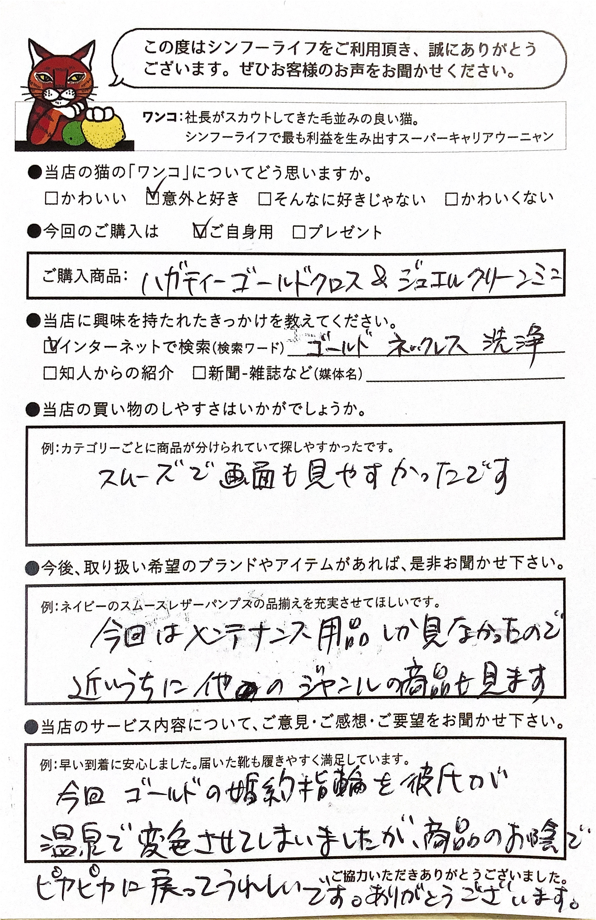 ご購入日:2025/9/22 T.N様 千葉県 女性 お声を頂いた商品: 今回ゴールドの婚約指輪を彼氏が温泉で変色させてしまいましたが、商品のお陰でぴかぴかに戻ってうれしいいです。ありがとうございます。 今回はメンテナンス用品しか見なかったので近いうちに他のジャンル商品もみ見ます。 |