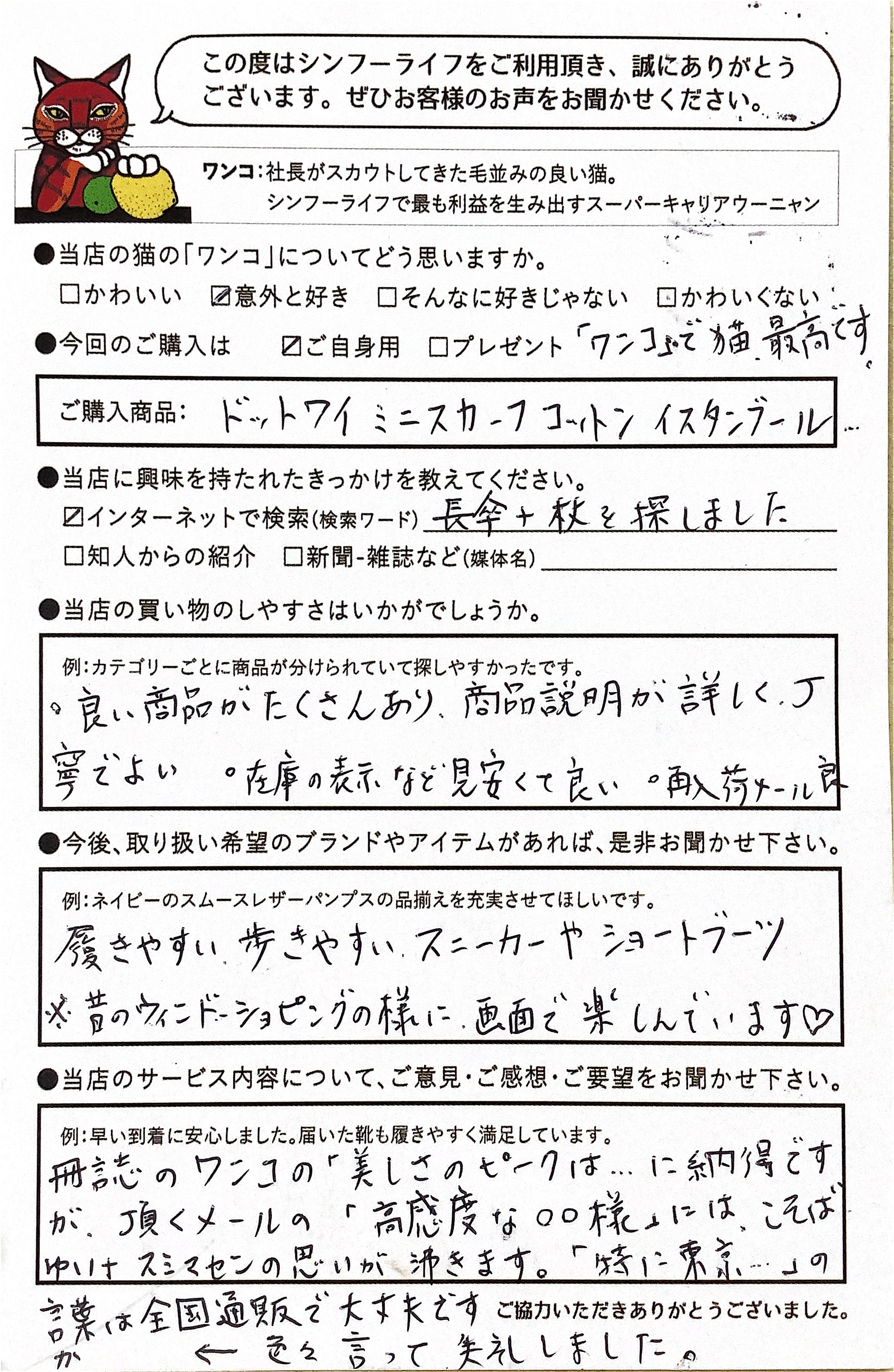 | 東京都 トレンドの服を扱っていただけると嬉しいです。ワイドパンツなど。 サイトの情報量が多く、少し見づらい気がします。 |