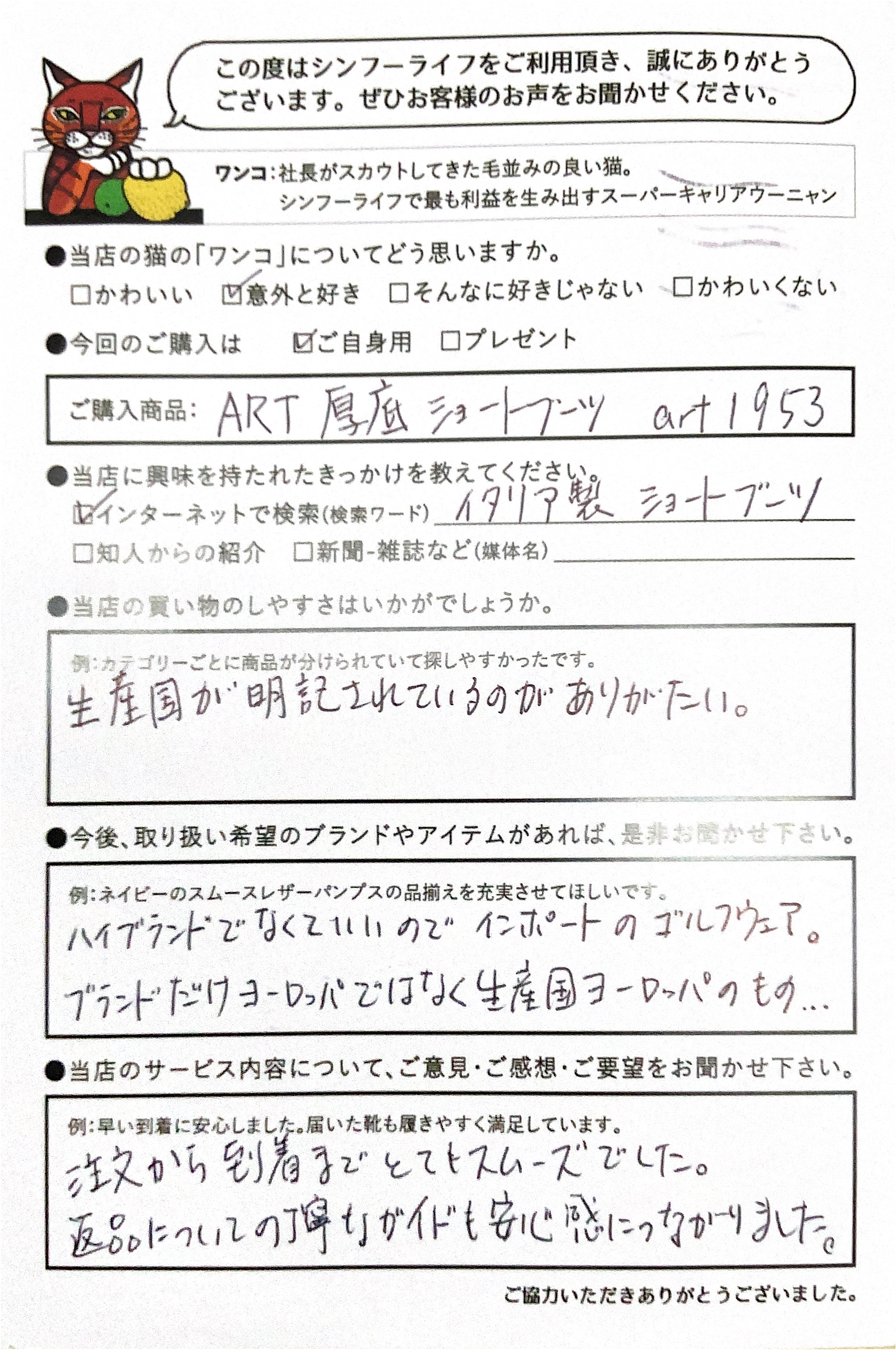 ご購入日:2025/12/8 I.E様 岡山県 女性 お声を頂いた商品: 靴底がぐにゃっと折れ曲がるほど柔らかい軽い履き心地の厚底ショートブーツ。 注文から到着までとてもスムーズでした。返品についての丁寧なガイドも安心感につながりました。 今後はハイブランドでなくていいので、インポートのゴルフウェア。ブランドだけヨーロッパではなく生産国ヨーロッパのものなど希望。 |