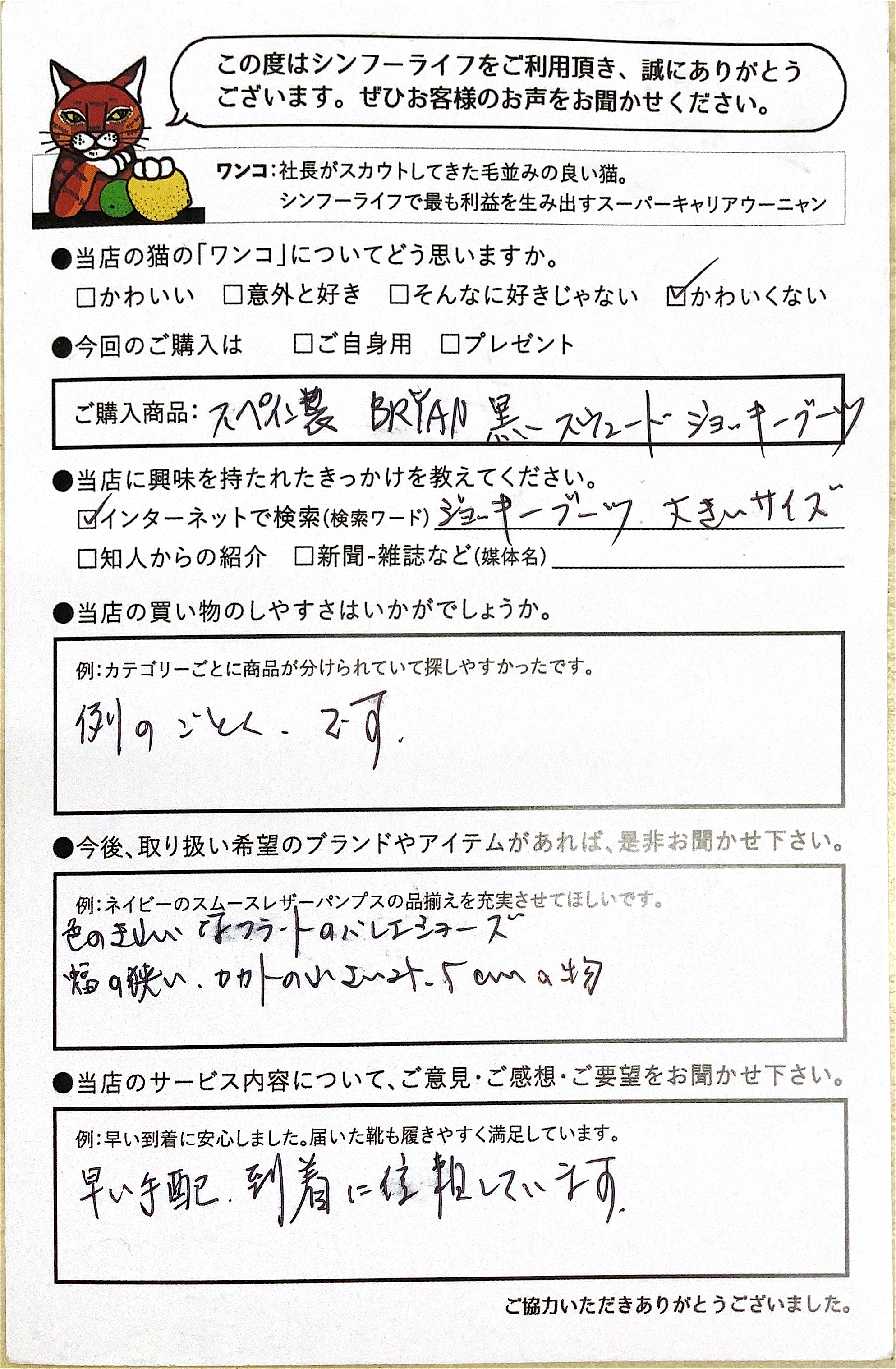 | 2018/02/14 KK様 女性 お声を頂いた商品: プリンチペアズールロングブーツ 何度かお買い物させていただいております。 レネールのコートもカシュビアンコのロングカーデもとてもお気に入りです! お店の個性とセンスがとても素敵だと思います。 今回ブーツをお願いしましたが、やはり靴はサイズが難しく,交換していただきました。 多分同じメーカーでも、フラットに近いのかヒールが高いのかでサイズ感が違うと思いますので試着サービスがあると嬉しいです(難しいとは思うのですが…)今回のブーツもとてもステキでした! 美しいな、合わせやすくて良いなと実感しています。 |