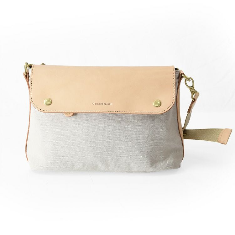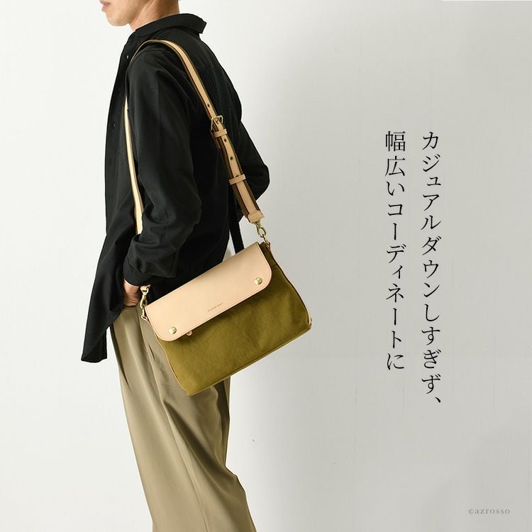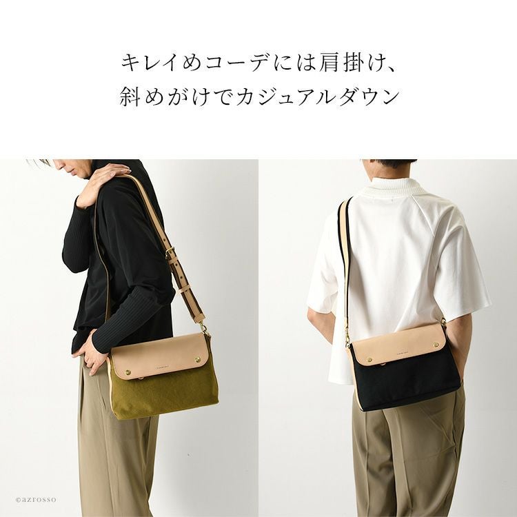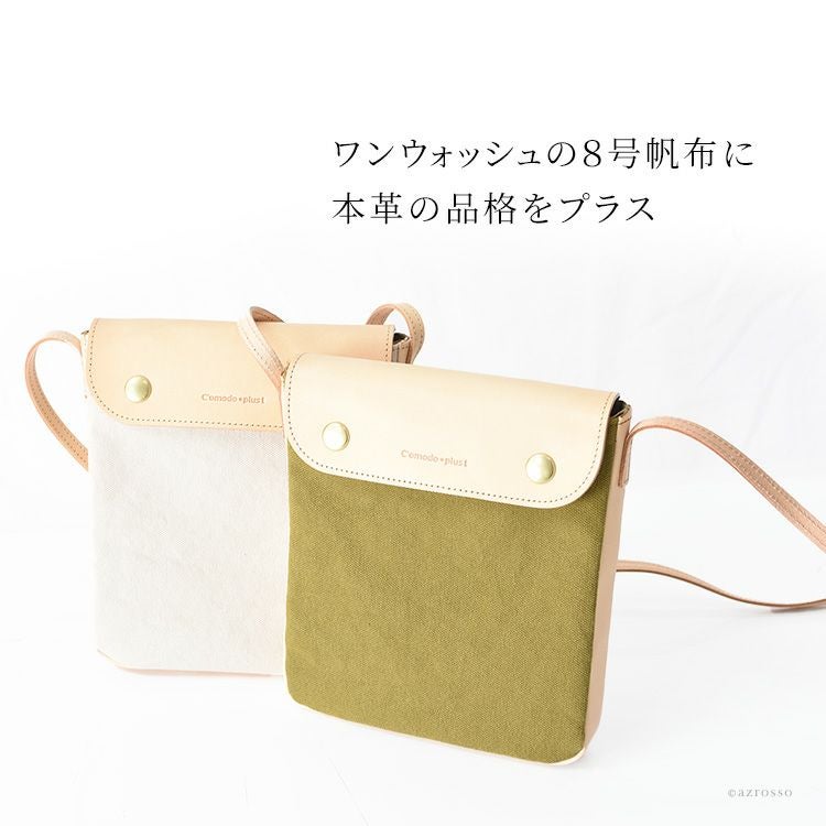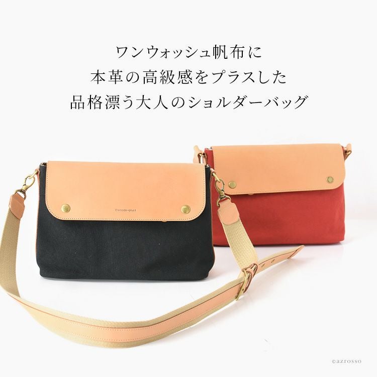 ちょっとしたお出かけから旅行にも重宝するC'omodo+plust(コモドプラスト)のショルダーバッグ。軽くて柔らい帆布に経年変化を楽しめるヌメ革をプラスしたショルダーバッグは大人のカジュアルコーデにぴったり 本革×綿 ショルダーバッグ 斜めがけ レザー バッグ 横型 ポシェット 日本製 バッグ ブランド コモドプラスト C'omodo+plust ブラック レッド ベージュ カーキ