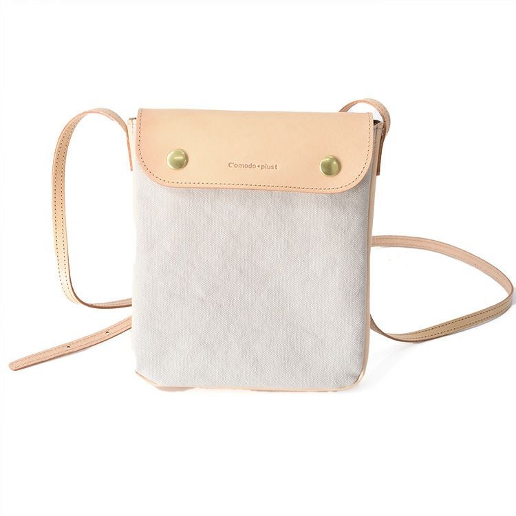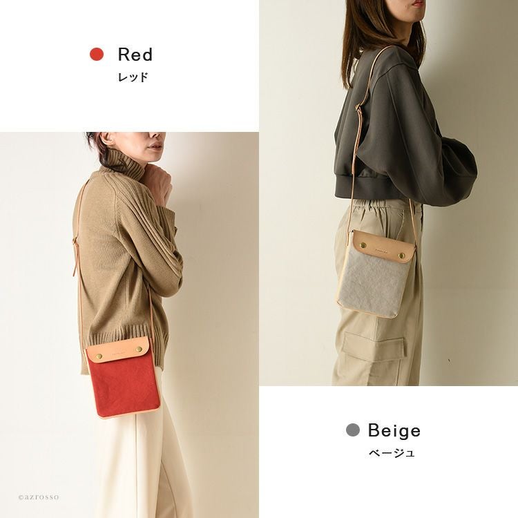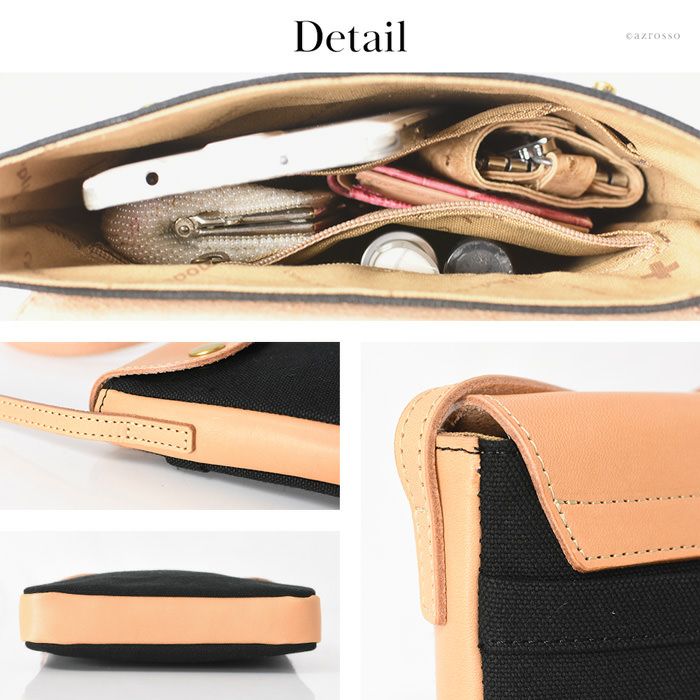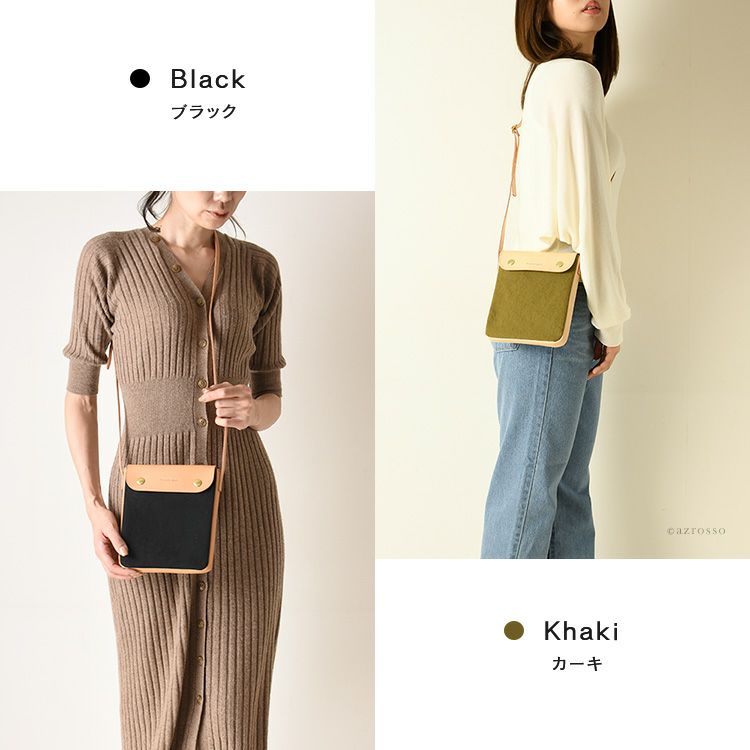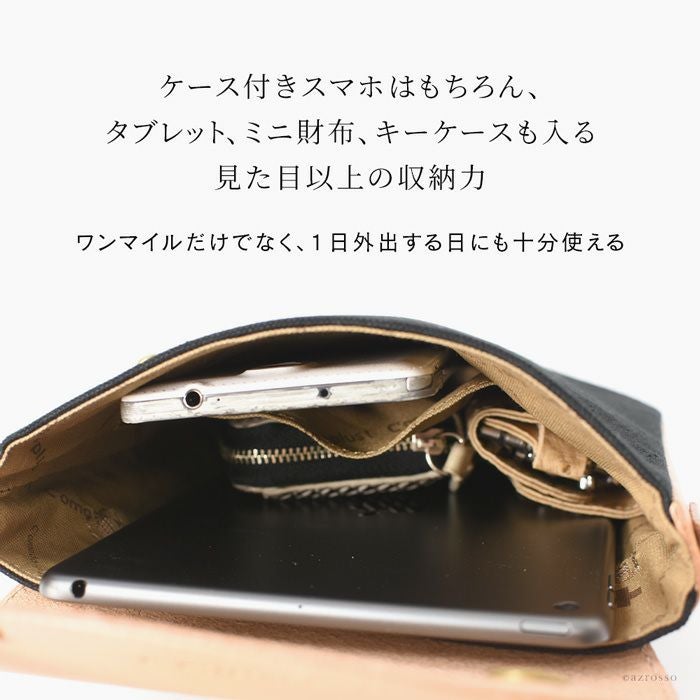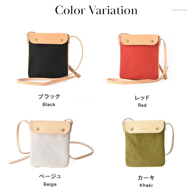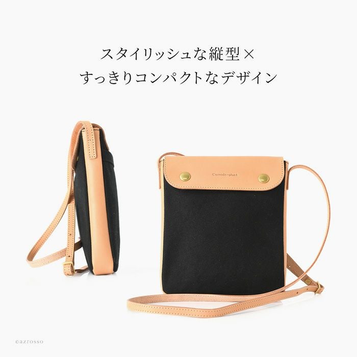 スマホ+小物も入れて手ぶらでお出かけができるC'omodo+plust(コモドプラスト)のポーチショルダー。帆布×レザーのショルダーバッグは大人のカジュアルコーデにぴったり 本革×綿 ミニショルダーバッグ 斜めがけ レザー バッグ 縦型 ポシェット 日本製 バッグ ブランド コモドプラスト C'omodo+plust ブラック レッド ベージュ カーキ ミニバッグ