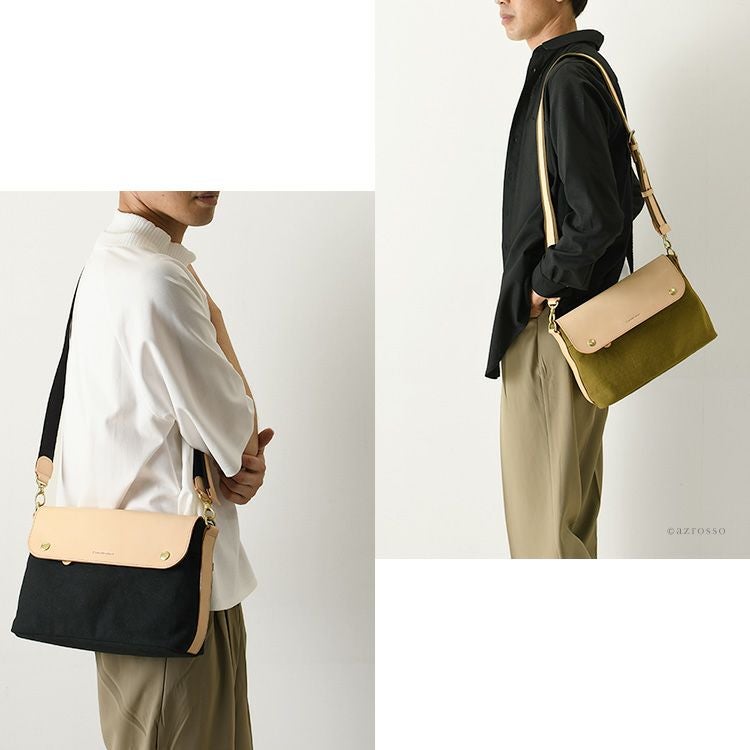 "ちょっとしたお出かけから旅行まで重宝するC'omodo+plust(コモドプラスト)のメンズショルダーバッグ。軽くて柔らい帆布に経年変化を楽しめるヌメ革をプラス した大人のカジュアルにぴったり" 本革×綿 メンズ ショルダーバッグ 斜めがけ レザー バッグ 横型 ポシェット 日本製 バッグ ブランド コモドプラスト C'omodo+plust ブラック レッド ベージュ カーキ